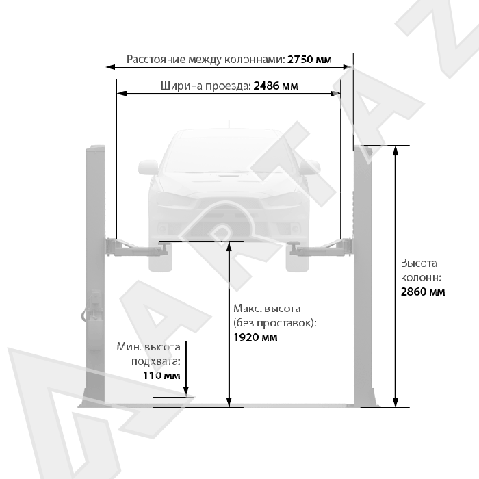 - Удобное рабочее пространство: расстояние между стойками 2750 мм, ширина проезда между колоннами 2486 мм, общая ширина подъемника 3370 мм.