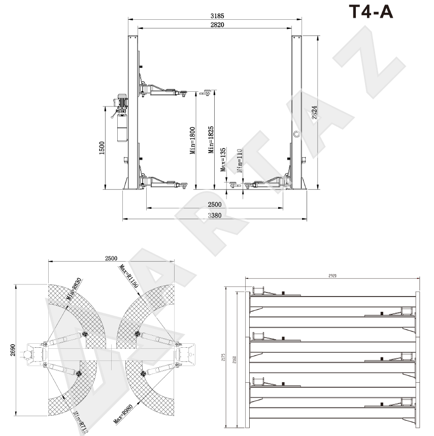 Электрогидравлический двухстоечный подъемник T4A бренда Atis применяется на станциях технического обслуживания, мастерских, частных гаражах для подъема легковых и внедорожных транспортных средств массой до 4 тонн на высоту до 1800 и 1825 мм, высота подхвата - 110 мм. Время подъема составляет 55 секунд. Расстояние между стойками подъемника составляет 2820 миллиметров. Автоподъемник за счет 3х фазного подключения двигателя на 20% меньше потребляет электроэнергию, обладает более плавным пуском и, как следствие, как следствие двигатель дольше прослужит так как меньше нагрузка на электрическую сеть. КПД на подъёмнике с подключением в 380 вольт, выше на 5% по сравнению с однофазным подключением. Для предотвращения произвольного опускания автомобиля подъемник оснащен надежной системой механической блокировки. Благодаря конструкции с нижней синхронизацией снимается ограничение на высоту обслуживаемых транспортных средств и высоту помещения, в котором монтируется подъемник. Тросы располагаются внизу и закрыты специальным трапом что исключает их повреждение автомобилем.