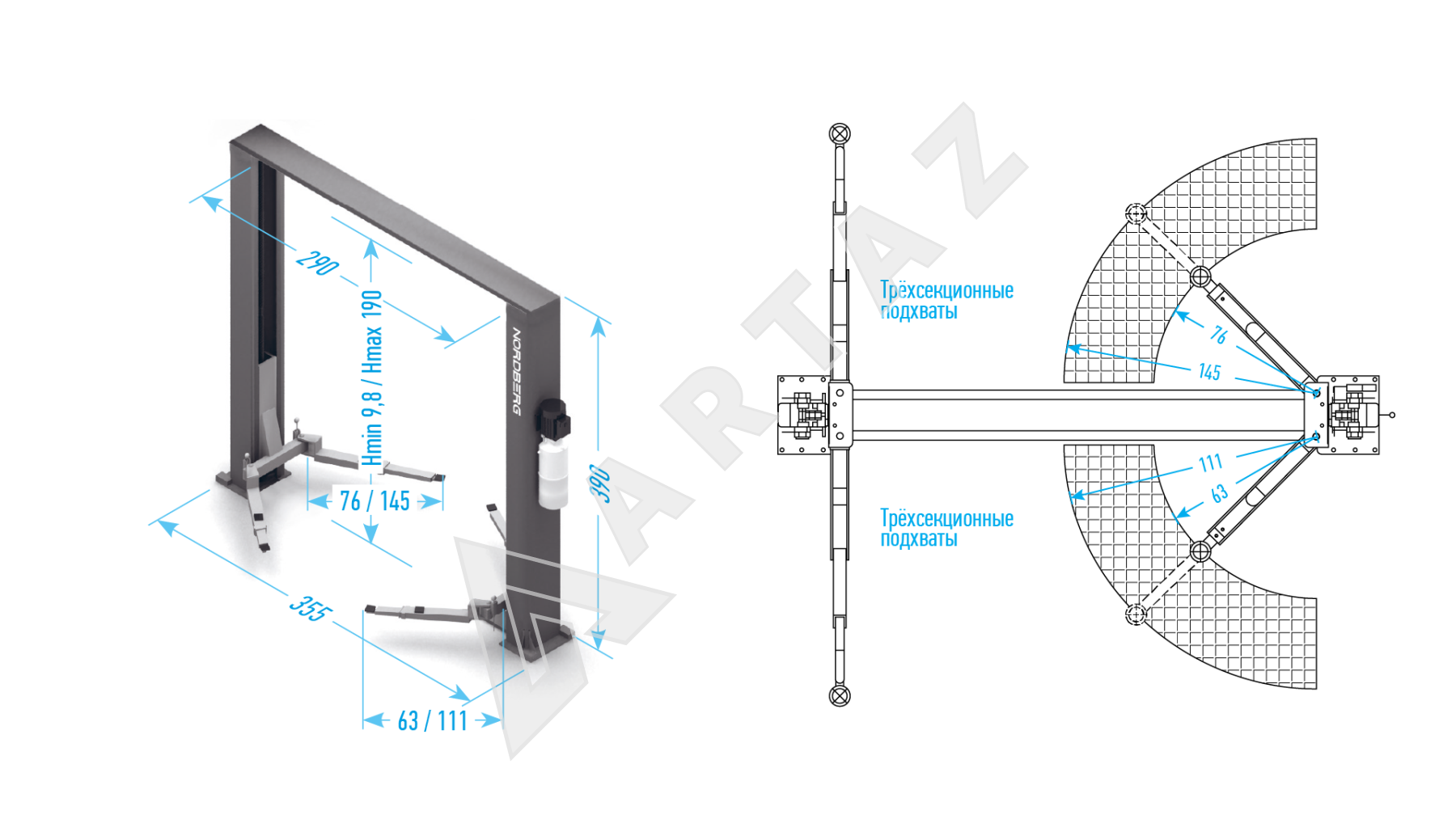 Двухстоечный подъемник Nordberg N4122HM-4G 4т, электрогидравлический, 380В, с верхней синхронизацией, 100-1900 мм