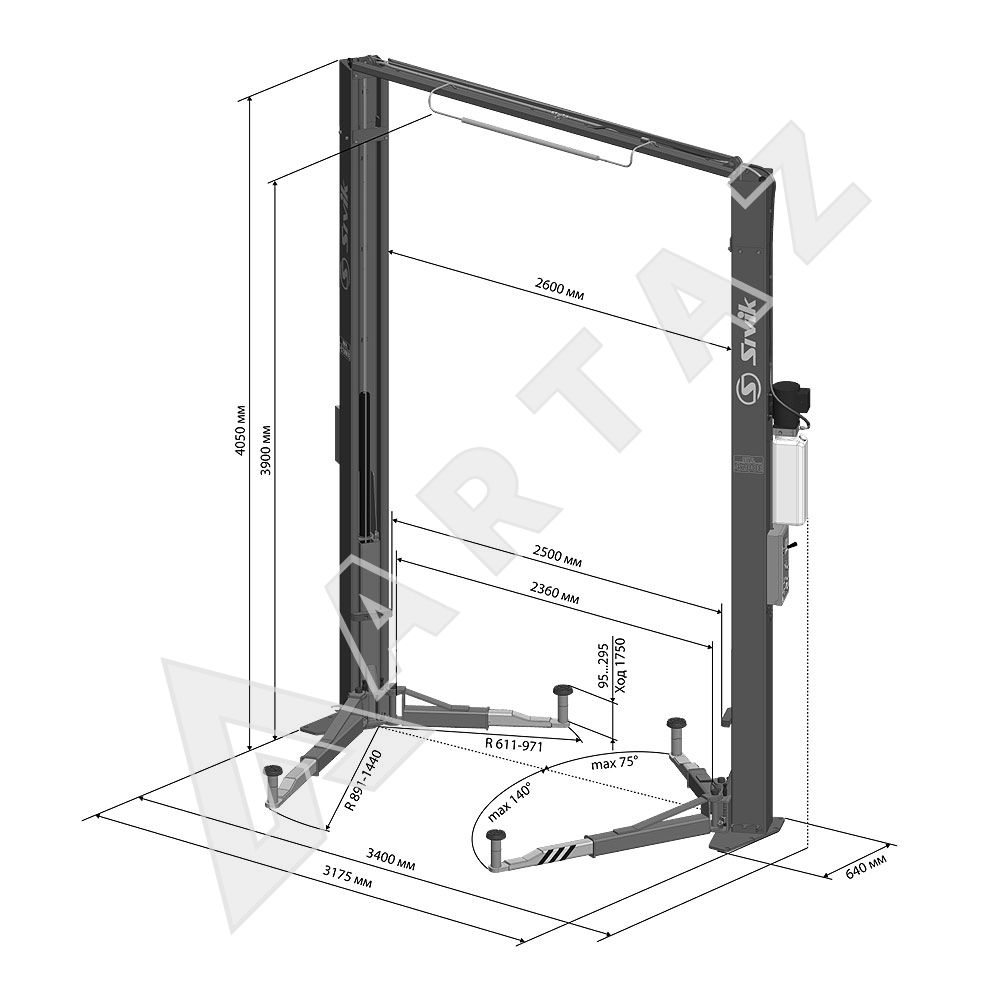 Двухстоечный подъемник Sivik ПГА-4200 4.2т, электрогидравлический, 380В, с верхней синхронизацией, 95-1750 мм