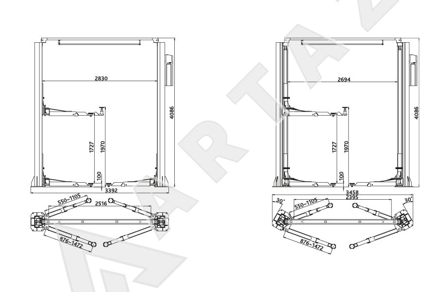 Двухстоечный подъемник Станкоимпорт PG212 4т, электрогидравлический, 380В, с верхней синхронизацией, 100-1970 мм