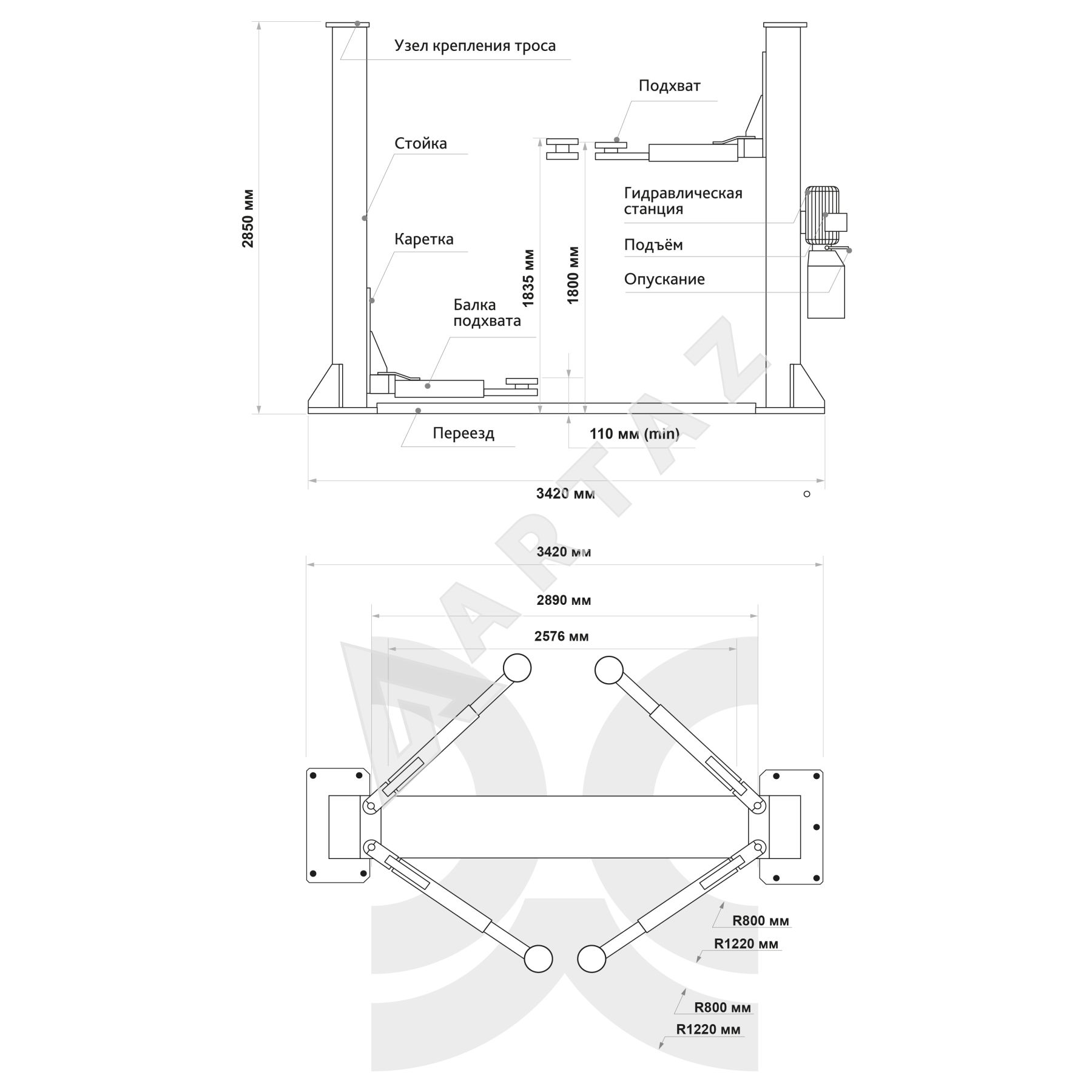 Двухстоечный подъемник Станкоимпорт ПГН2-4.0 (П) 220В 4т, электрогидравлический, 220В, с нижней синхронизацией, 110-1800 мм