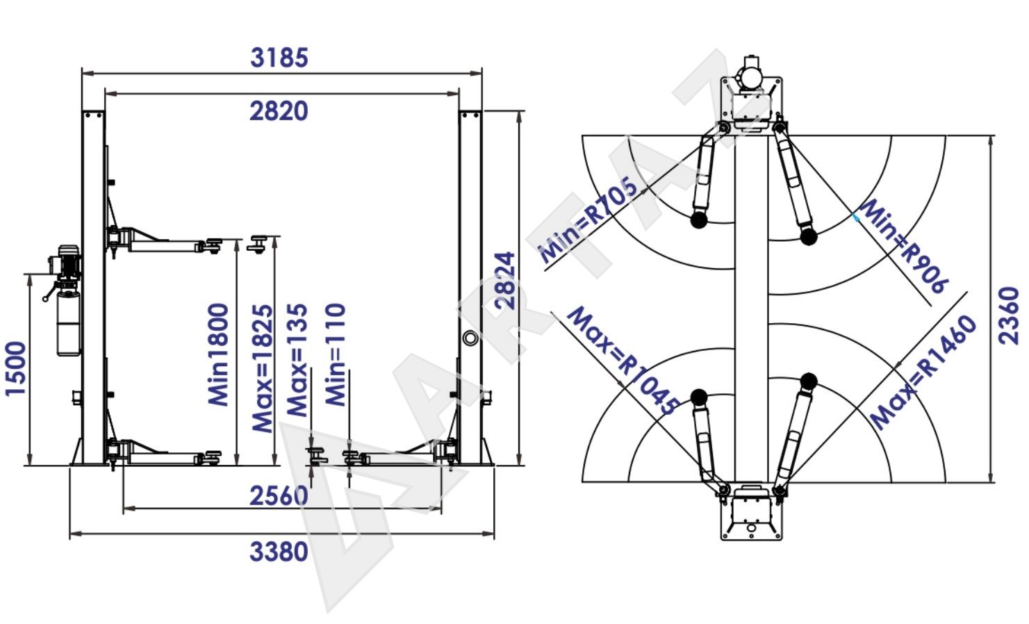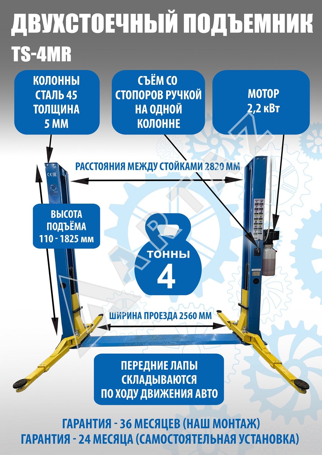 Двухстоечный подъемник Техносоюз TS-4MR 4т, электрогидравлический, с нижней синхронизацией, 110-1800 мм