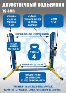 Электрогидравлический двухстоечный подъемник TS-4MR бренда Техносоюз применяется на станциях технического обслуживания, мастерских, частных гаражах для подъема легковых и внедорожных транспортных средств массой до 4 тонн на высоту до 1800 мм, высота подхвата - 110 мм. Время подъема составляет 50 секунд. Расстояние между стойками подъемника составляет 2820 миллиметров. Для предотвращения произвольного опускания автомобиля подъемник оснащен надежной системой механической блокировки. Благодаря конструкции с нижней синхронизацией снимается ограничение на высоту обслуживаемых транспортных средств и высоту помещения, в котором монтируется подъемник. Тросы располагаются внизу и закрыты специальным трапом что исключает их повреждение автомобилем. Передние лапы складываются назад.