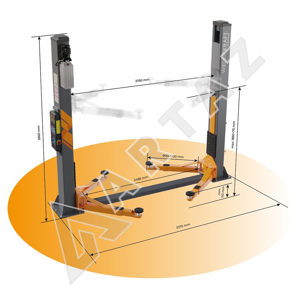 Двухстоечный подъемник Wiederkraft WDK-522E 4т, электрогидравлический, 380В, с нижней синхронизацией, 110-1920 мм