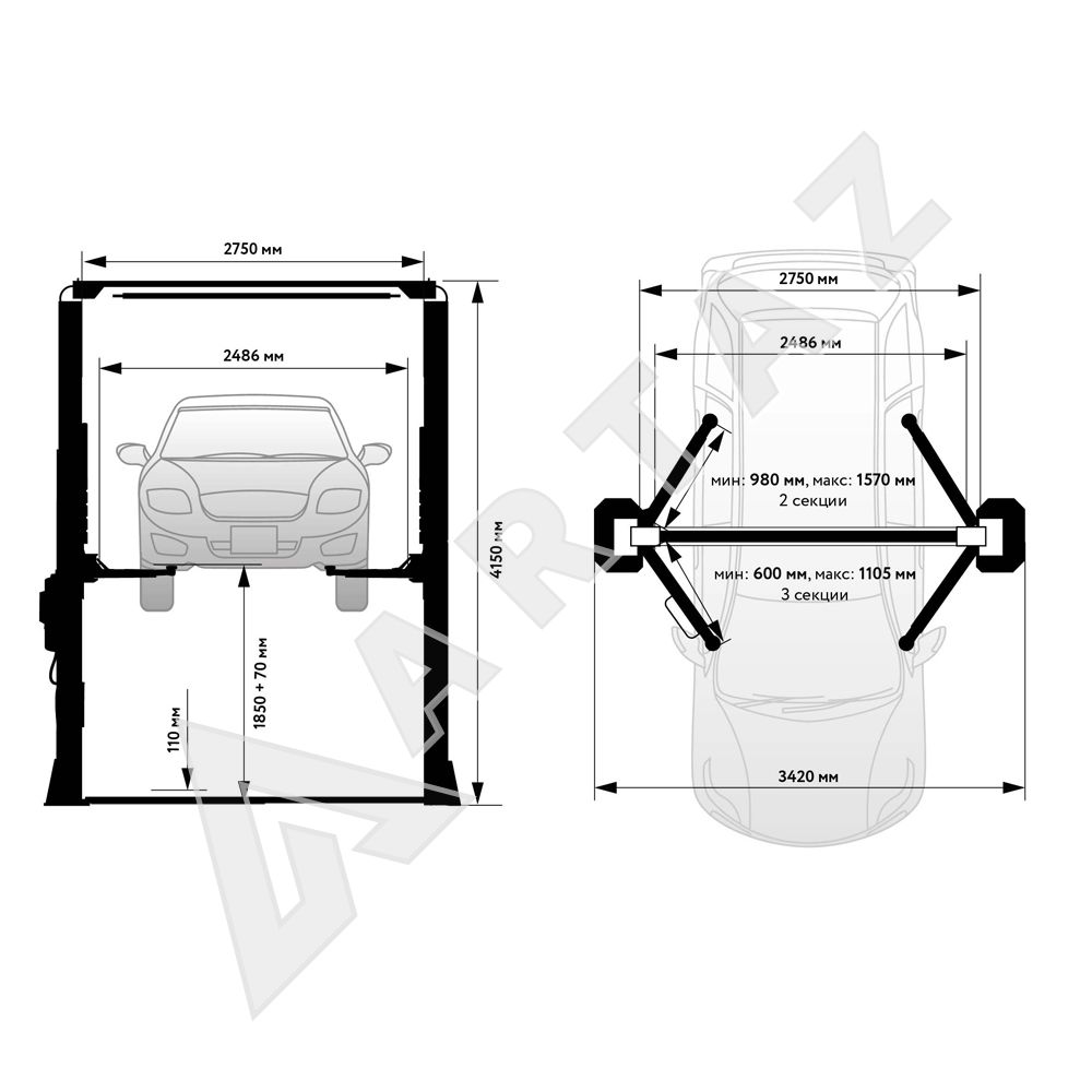 Ширина подъемника (снаружи), мм:3420