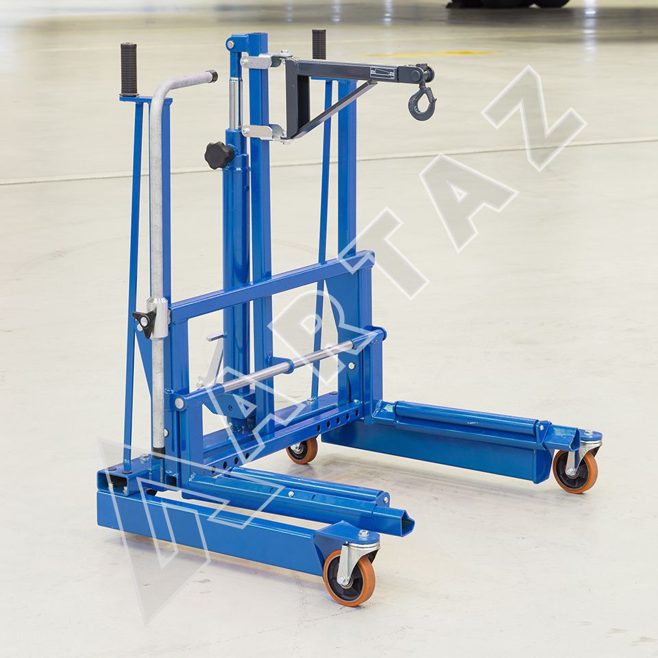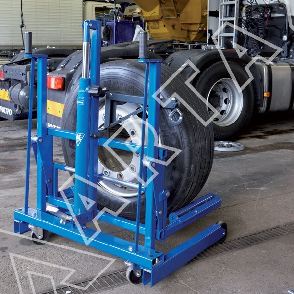 Тележка решает задачи по подъему, фиксации и перемещению колес на фургонах, грузовиках, автобусах и специализированной технике — подходит как для отечественных, так и для импортных автомобилей. Регулируемые подъемные рычаги адаптируются под диаметры шин от 270 до 1300 мм и ширину до 600 мм, что делает WTA500 универсальным решением для мастерских с широким парком техники. Ножной гидравлический привод освобождает руки оператора, роликоподшипники облегчают поворот колеса, а фиксирующий кронштейн гарантирует надежную фиксацию при транспортировке.