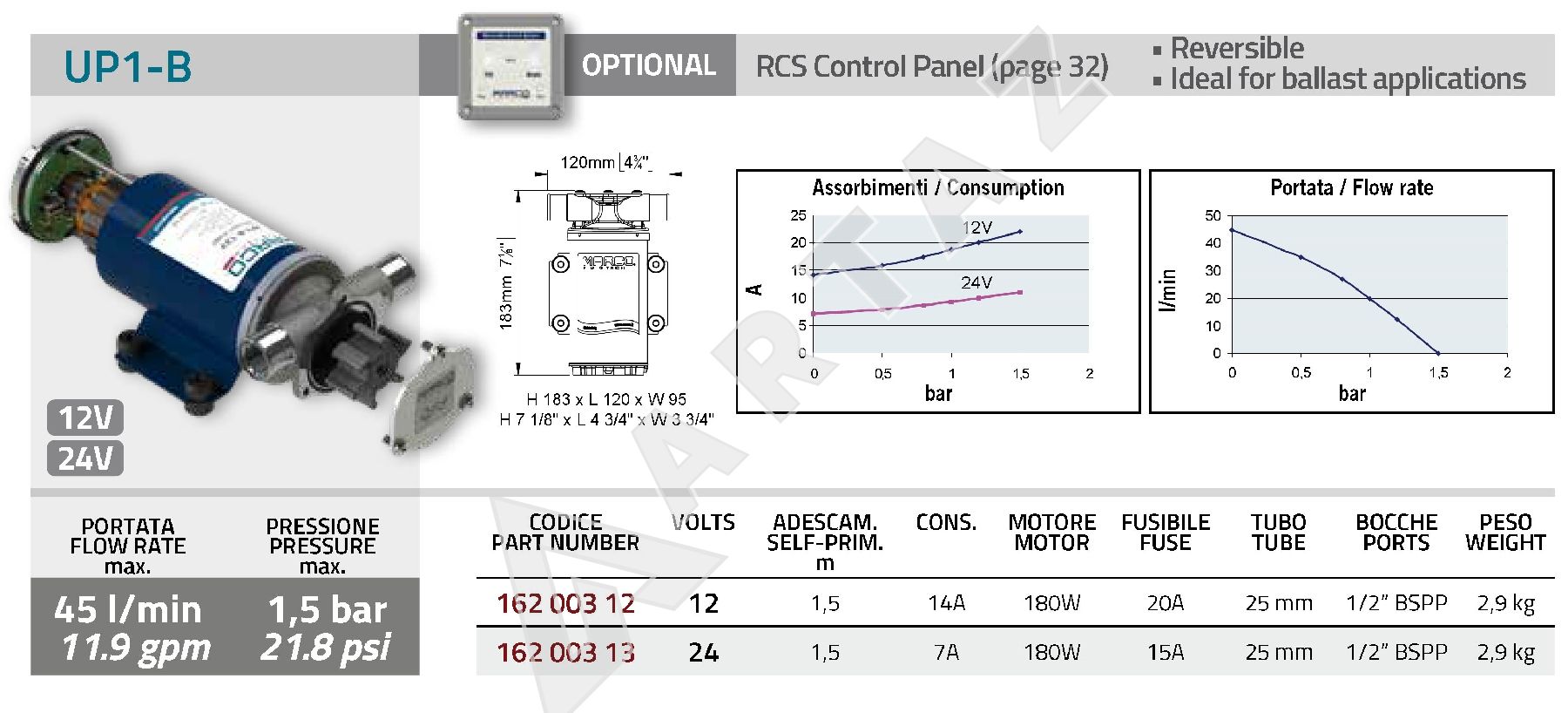 Компактные габариты (179х120х94 мм) и легкий вес (всего 2,9 кг) делают насос Marco UP1-B идеальным выбором для использования в ограниченных пространствах, таких как малые суда, трейлеры, и дачные участки. Система входных и выходных отверстий диаметром 1/2 дюйма (15 мм) обеспечивает удобное подключение.