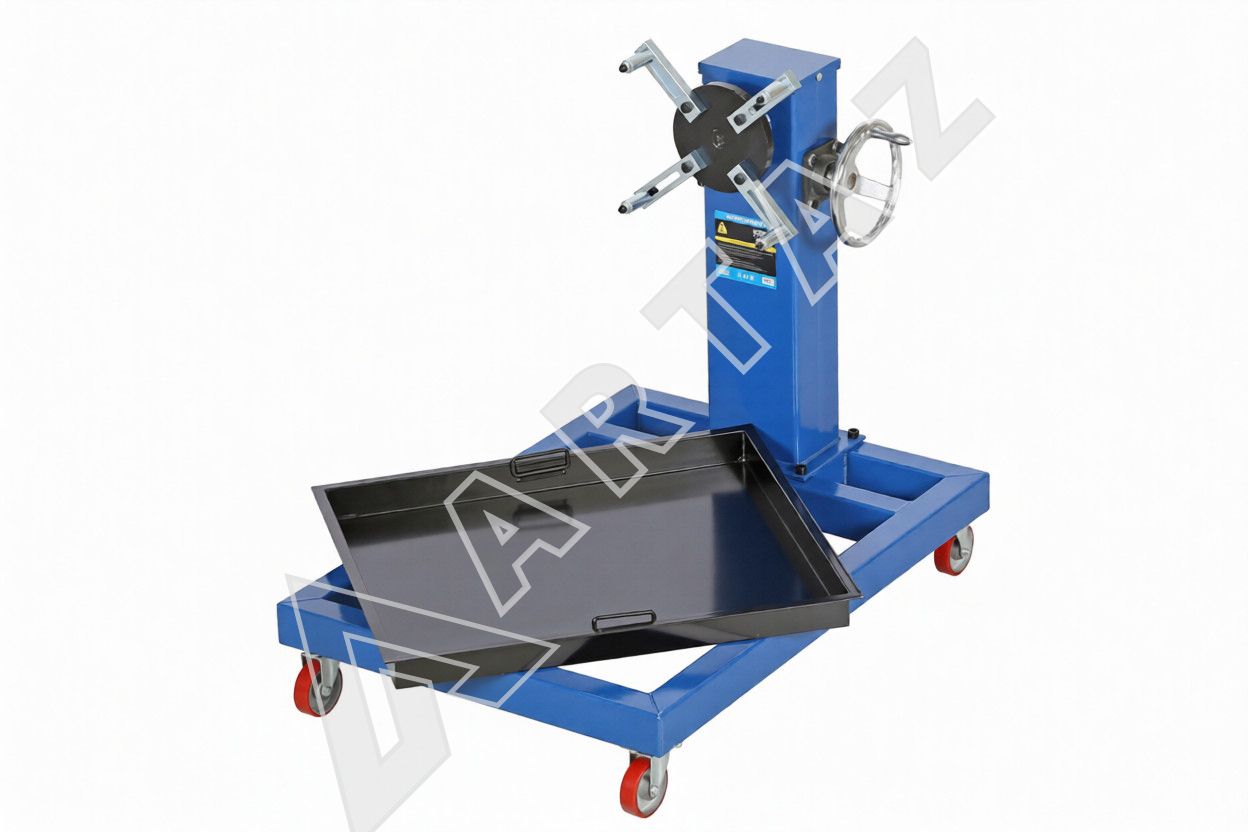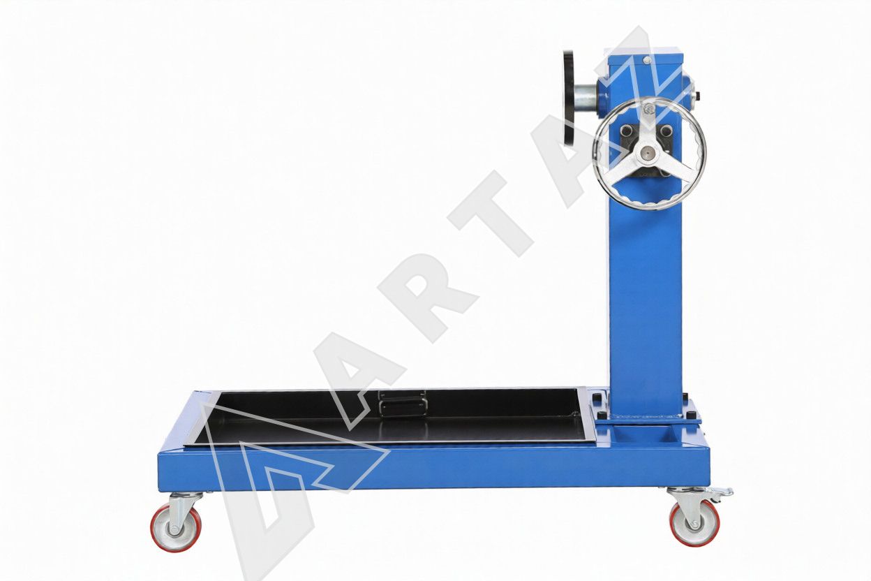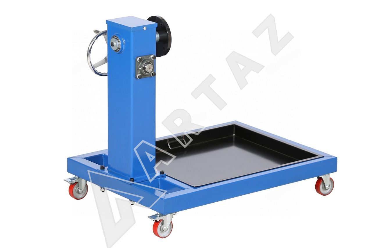 Оборудование обеспечивает надежное крепление и точное позиционирование двигателя или КПП, значительно облегчая доступ к рабочим зонам агрегата. Редукторный механизм обеспечивает вращение подвешенного агрегата на 360°, что ускоряет выполнение операций разборки, сборки и технического обслуживания. Мобильность кантователя обеспечивается поворотными колесами с фиксаторами, позволяя быстро перемещать инструмент между рабочими зонами.