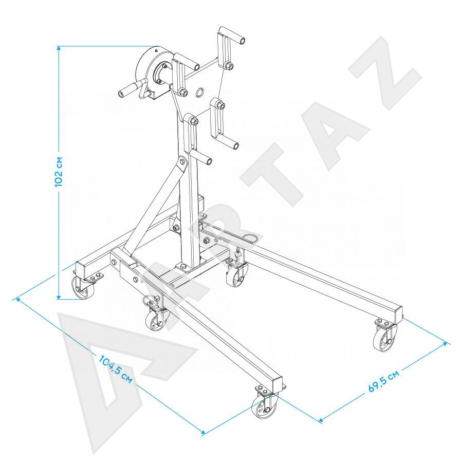 Устройство решает задачи полного контроля над двигателем — его поворот на 360°, фиксация в нужном положении и безопасность работ. Кантователь подходит как для легковых, так и для грузовых автомобилей, а также для специализированной техники. Надежная П-образная конструкция с регулируемыми кронштейнами обеспечивает совместимость с различными моделями двигателей. Компактная складная конструкция помогает экономить место на рабочем месте и облегчает транспортировку оборудования. Имеет 6 колес для удобного перемещения по гаражу или СТО.