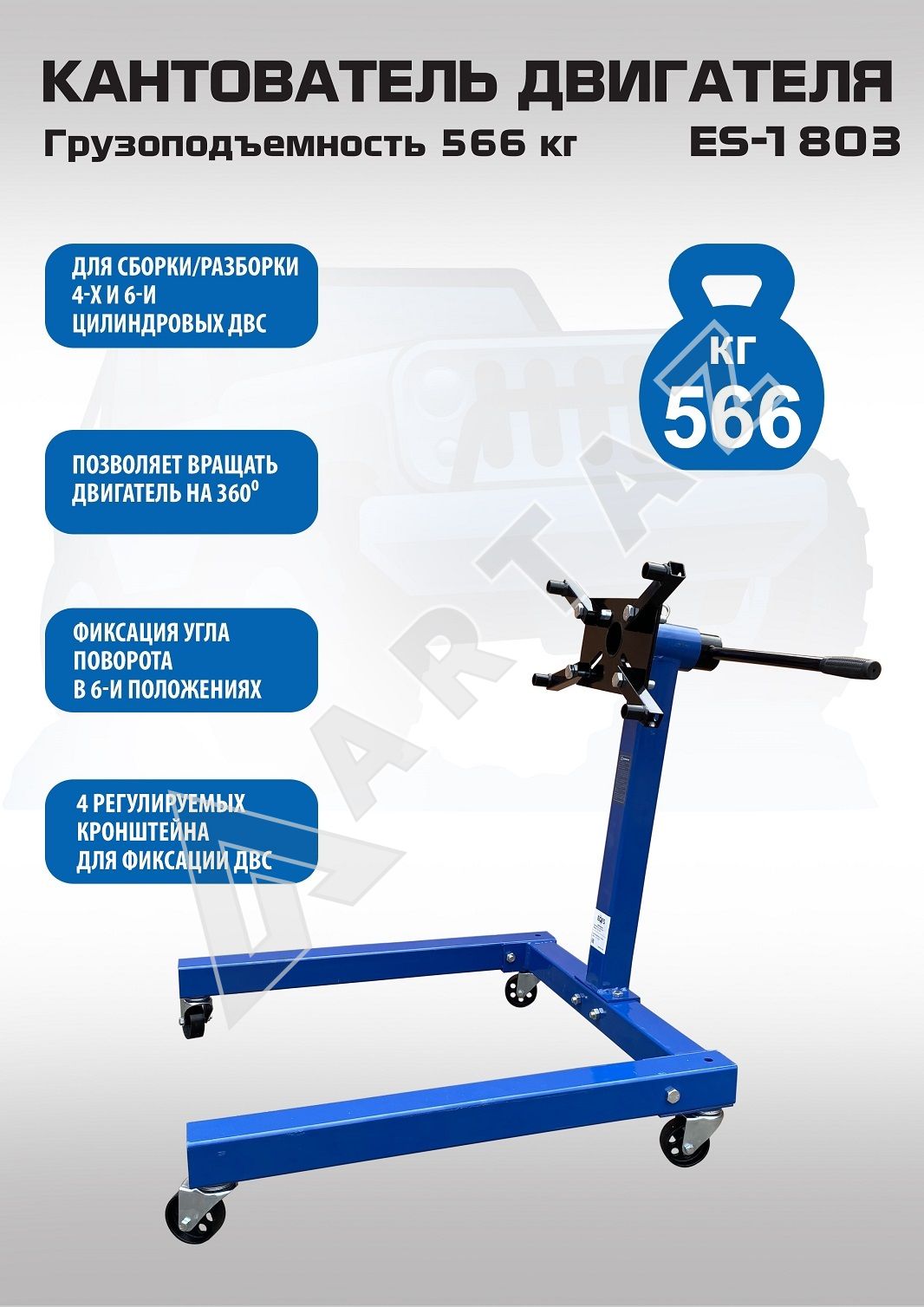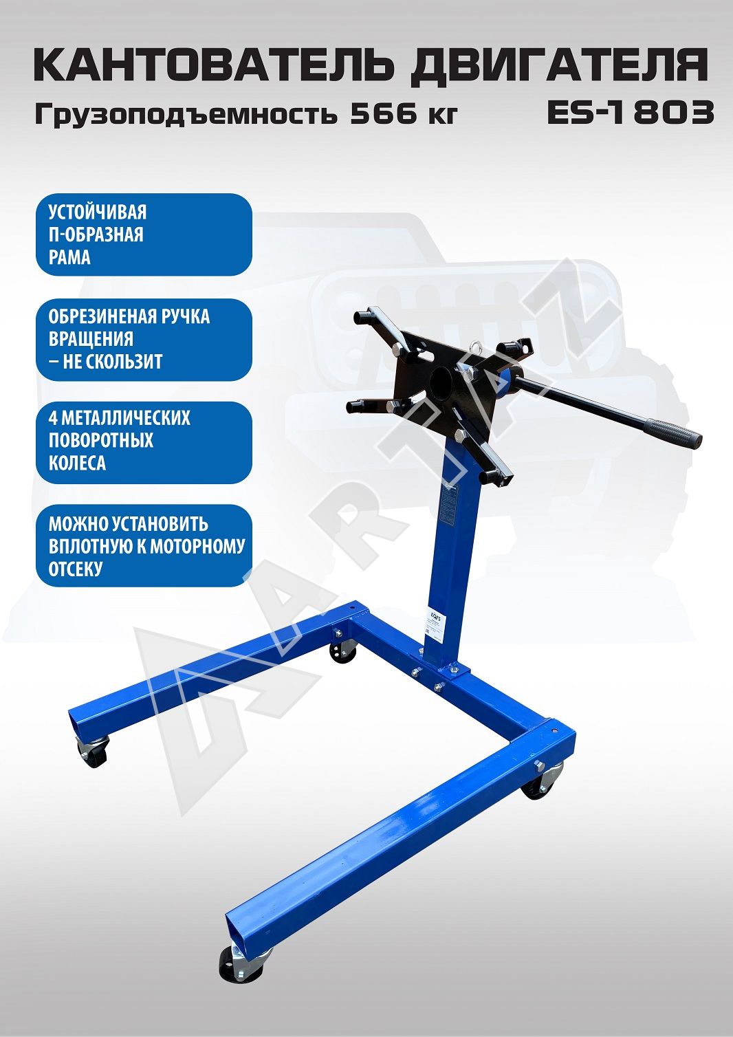 Кантователь двигателя ES-1803 предназначен для надежного крепления и удобного вращения силовых агрегатов массой до 566 кг. Он идеально подходит для автосервисов, мастерских и станций технического обслуживания, где важно безопасно и быстро выполнять ремонтные работы.