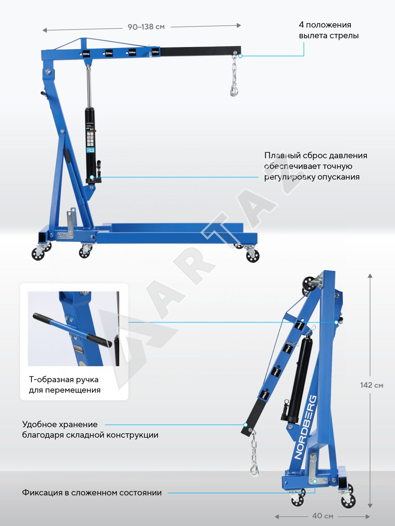 Кран гаражный подкатной Nordberg N3707 предназначен для подъёма и перемещения тяжёлых автомобильных узлов и агрегатов весом до 680 кг. Идеально подходит для автосервисов, СТО, гаражей и мастерских, где требуется безопасное и точное обращение с деталями различного типа транспорта.