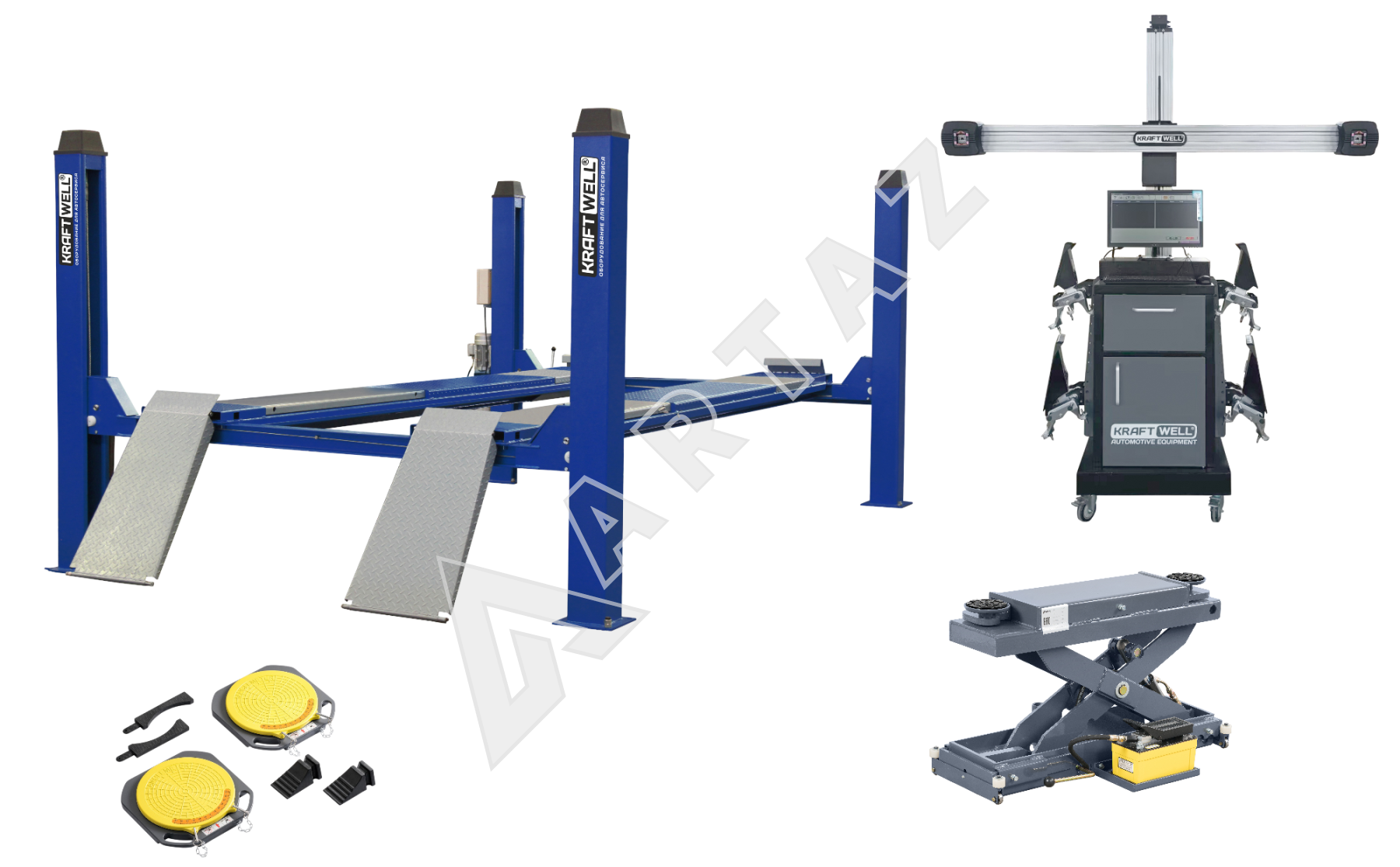 Состав комплекта:Стенд сход-развал , Поворотные круги , Подъемник четырехстоечный , Траверса