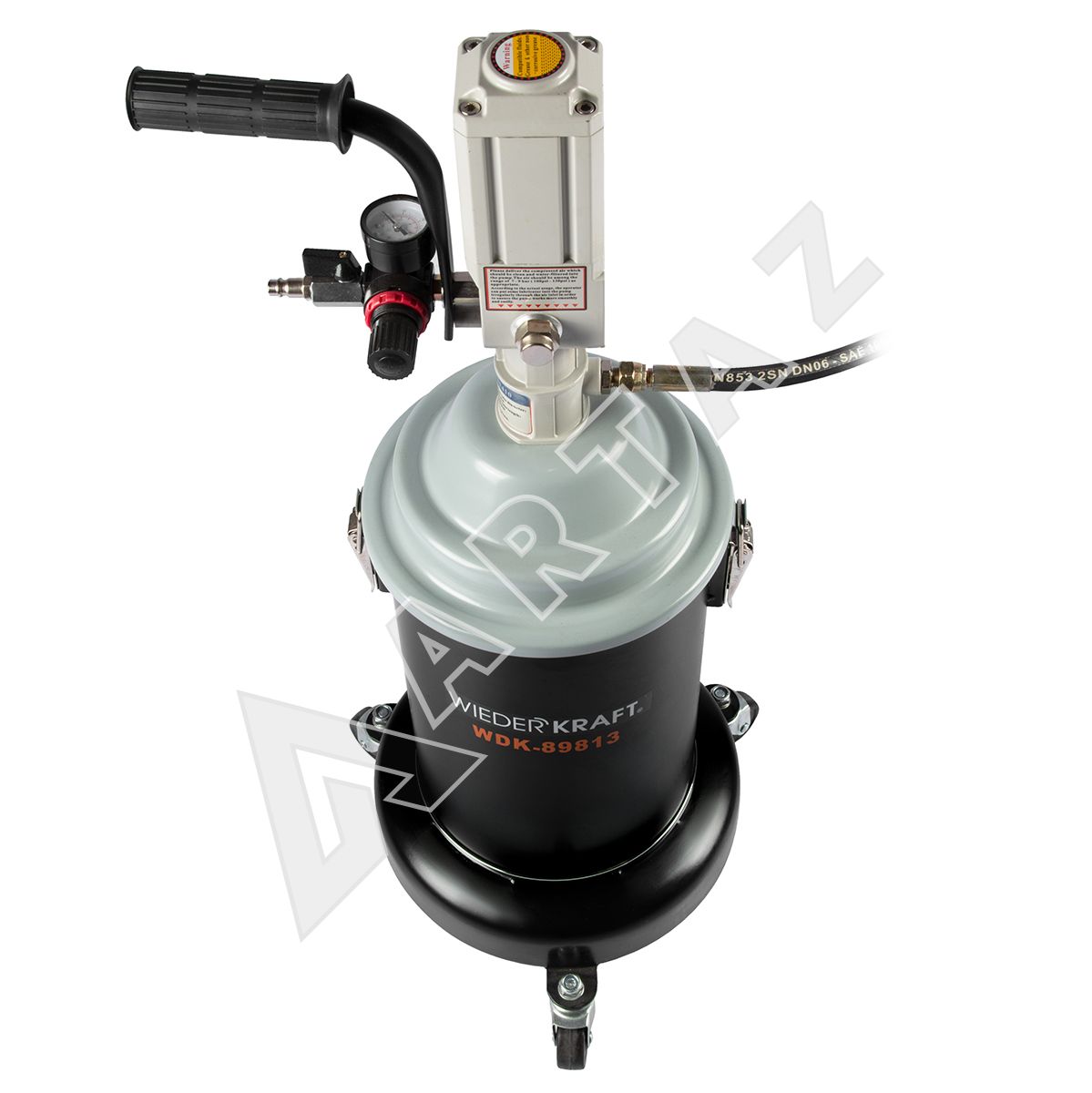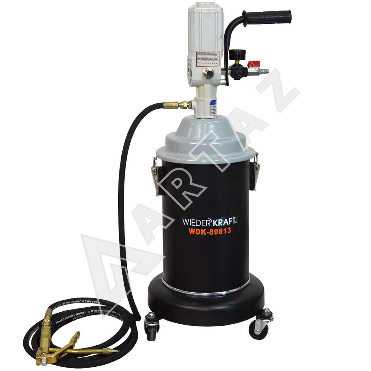 Нагнетатель смазки для бочек на 13 л, Wiederkraft WDK-89813 6-8 бар, пневматический, с максимальным давлением смазки 30 МПа, с тележкой