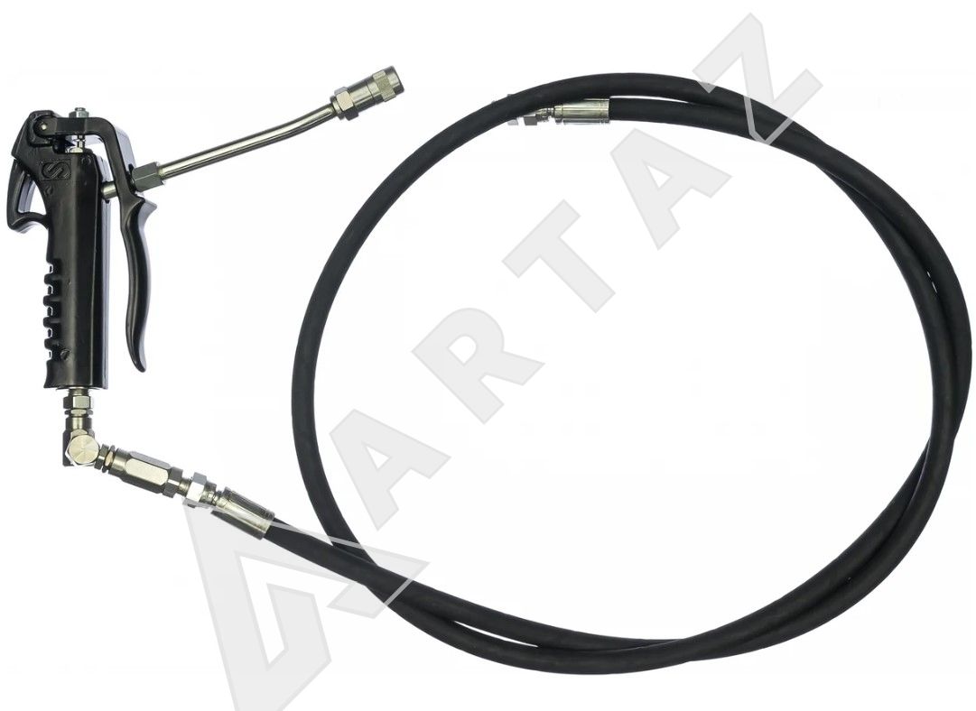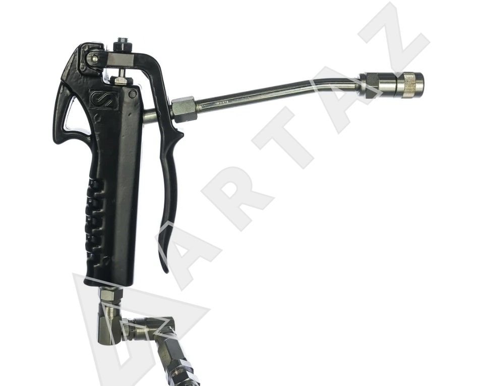 Пистолет, предусмотренный в конструкции пневматического нагнетателя смазки с насосом PumpMaster 3, относится к ручному типу. Он имеет жесткий металлический носик и шарнирное Z-образное соединение на входе.