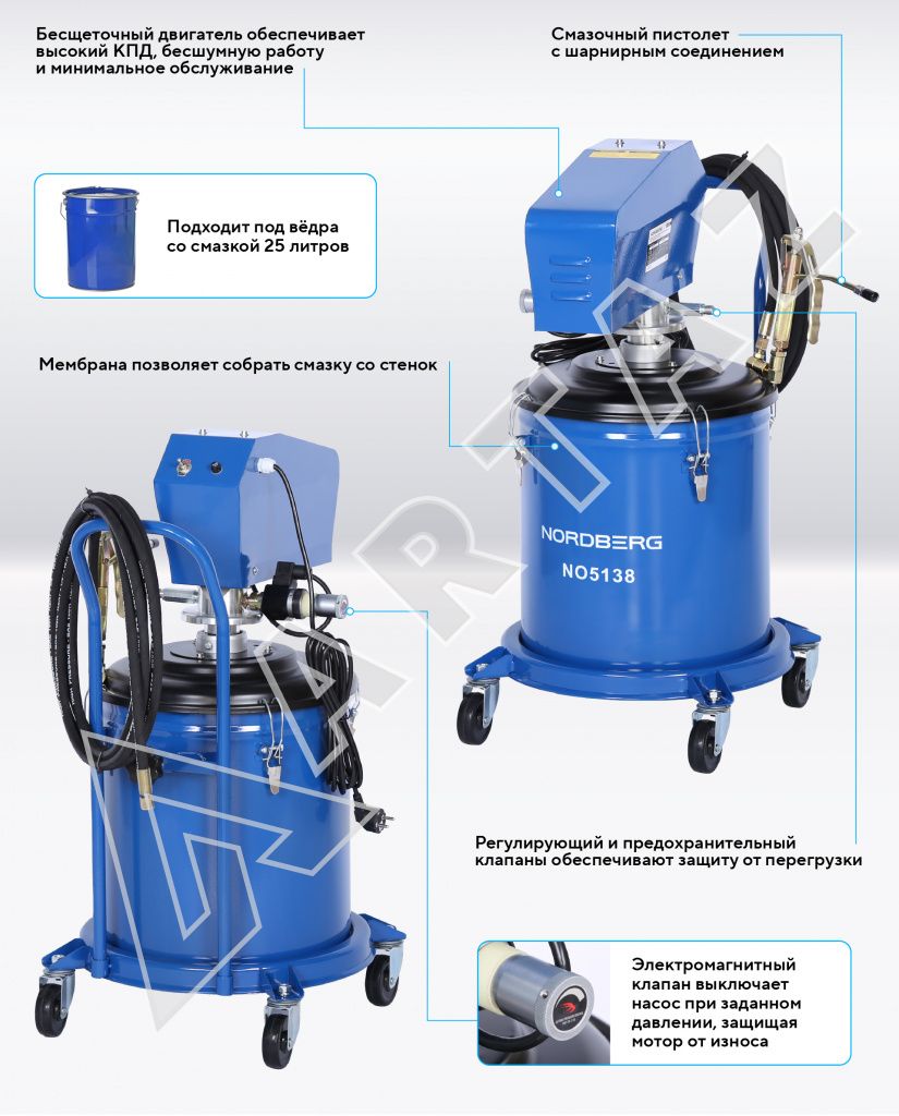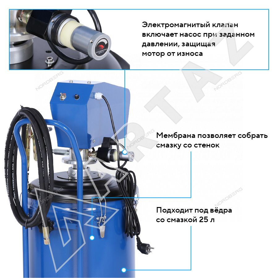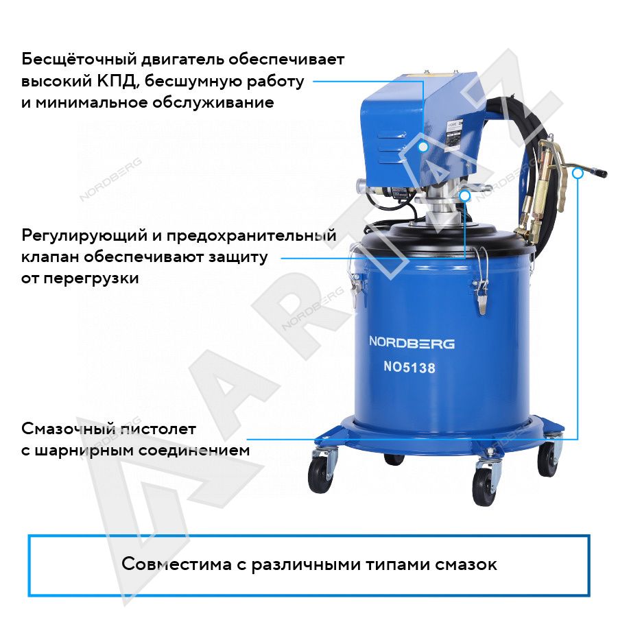 Нагнетатель смазки электрический, емкость 38 л, давление 250 бар, производительность 0.75 л/мин, от сети 220В, Nordberg NO5138