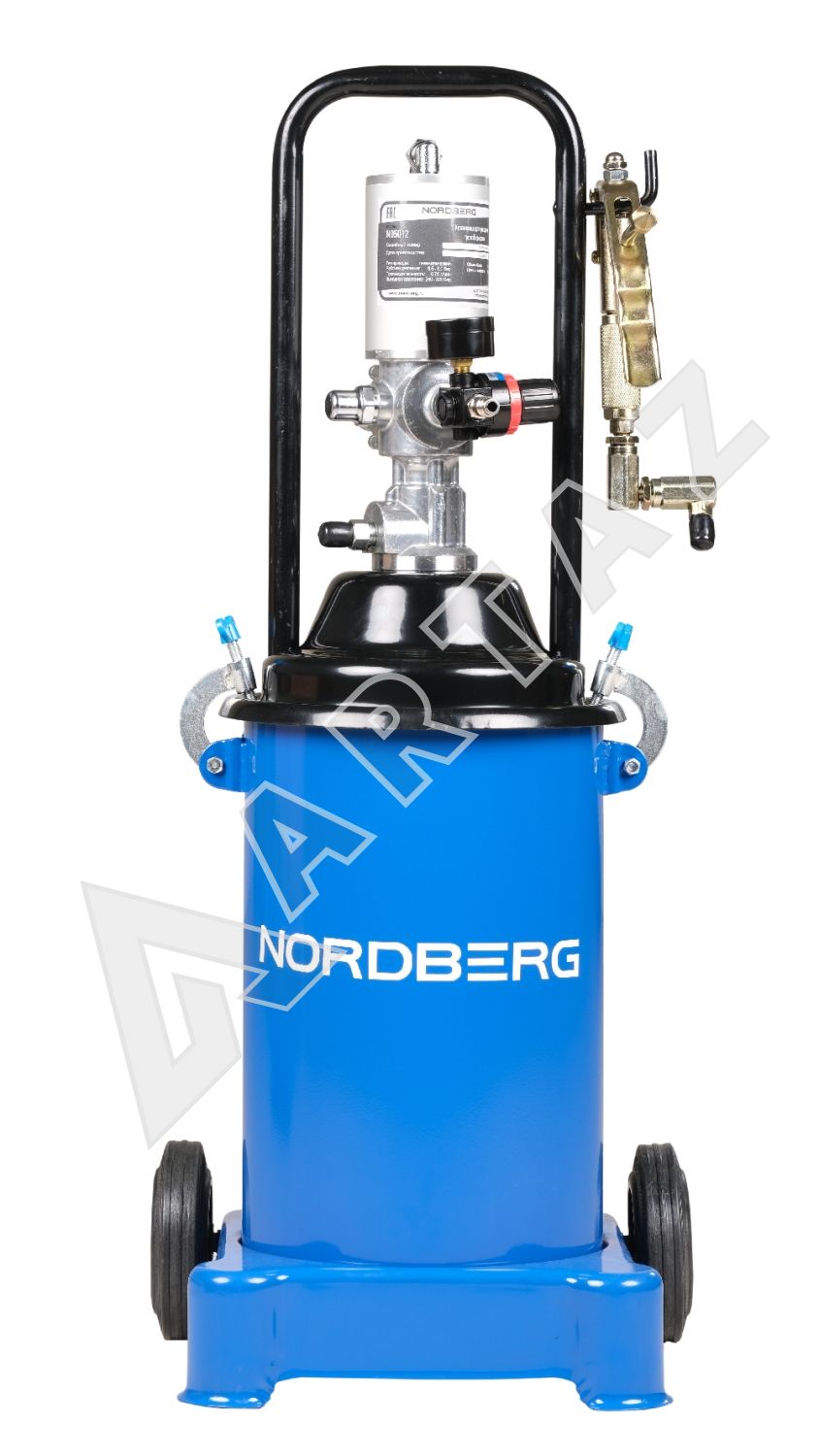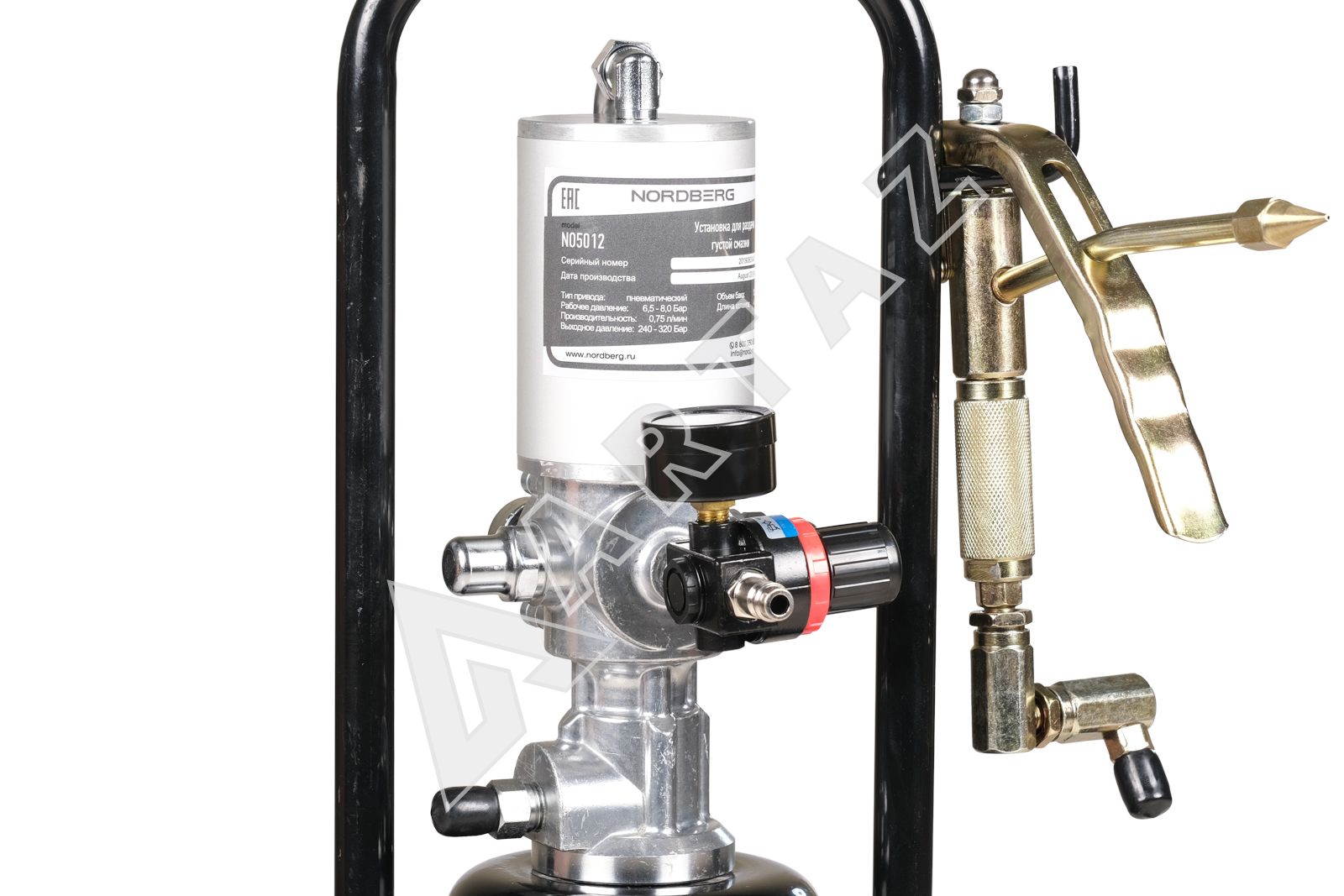 Пневматическая установка NORDBERG NO5012 предназначена для подачи густых смазок, таких как солидол, литол и другие консистентные смазки до классов NLGI-2 и NLGI-3, из 12-литровых бочек в различные агрегаты автомобилей и станков.