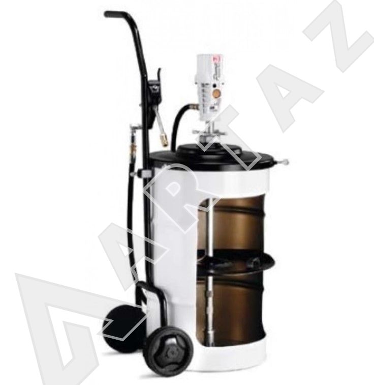 Мобильная установка для смазки, рассчитанная на использование с веществами до NLGI-2, представляет собой отличную альтернативу стационарным АЗС. Для её работы требуется компрессор со сжатым воздухом, который за счёт высокого давления приводит в действие поршневой насос. Испанский насос способен выдавать 540 граммов смазки в минуту, что позволяет отпускать до 32,4 килограмма в час.