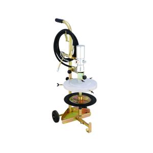 Пневматический нагнетатель для густой смазки Техносоюз TS79025 комплектуется тележкой для бочек объемом 20-60 кг. В комплект входят пневматический насос с соотношением 50:1 и производительностью 800 г/мин, мембрана и крышка для солидолонагнетателя, шланг длиной 4 м и раздаточный пистолет с наконечником. Нагнетатель оснащен двумя прямыми колесами и имеет массу 16 кг.