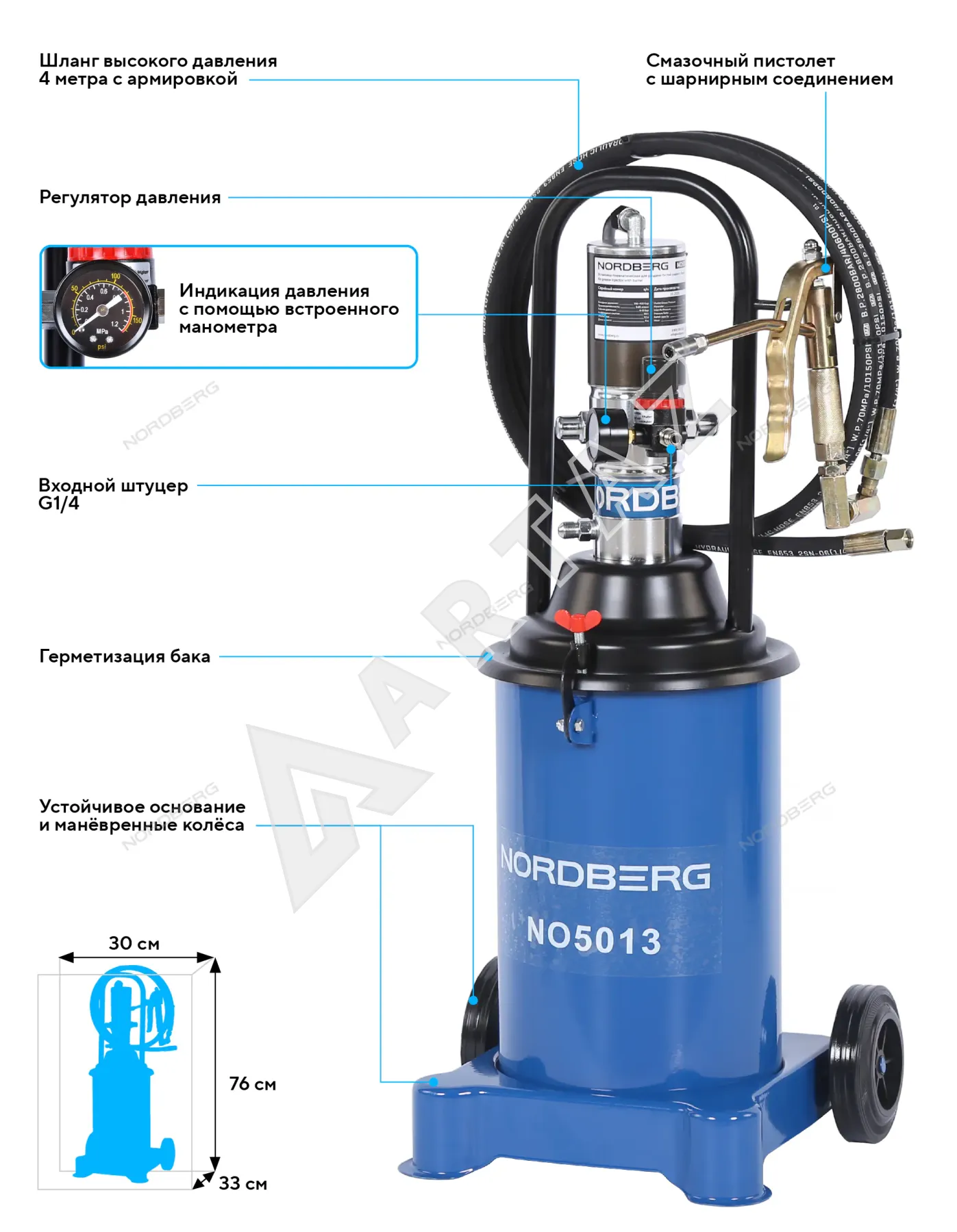 Нагнетатель смазки пневматический, емкость 12 л, давление до 400 бар, с шарнирным пистолетом NO5013 Nordberg