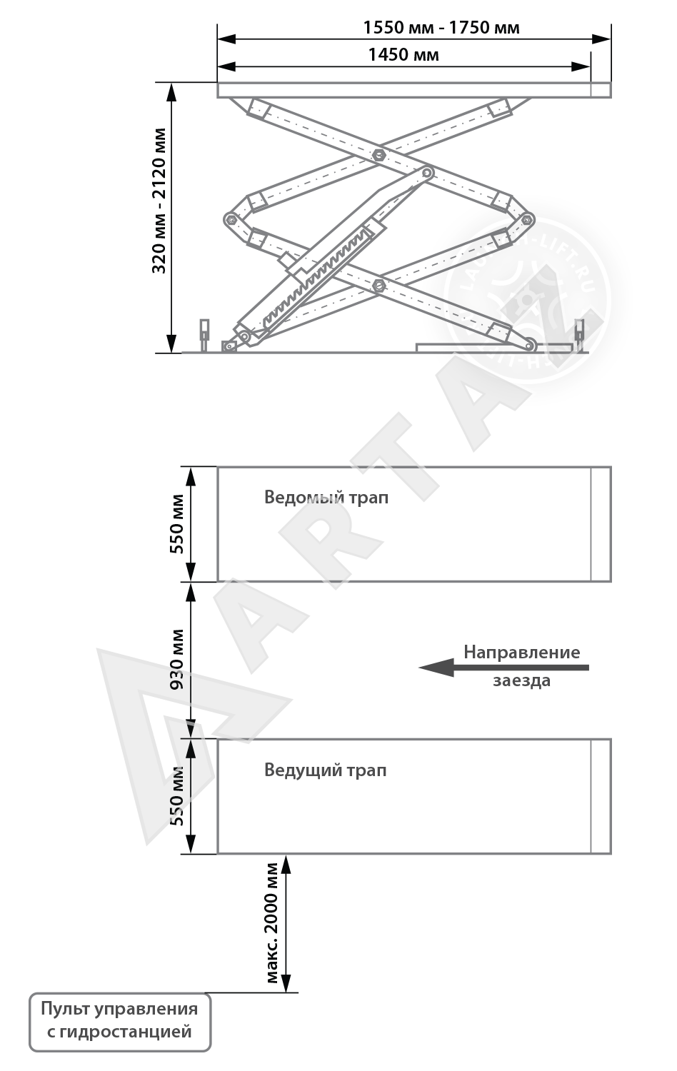 - Ножничная электрогидравлическая конструкция с двумя платформами (ширина каждой 550 мм, общая длина подъемника 1750 мм) для устойчивого размещения автомобиля.