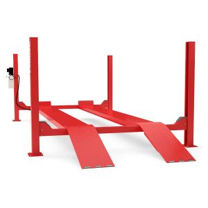 Грузоподъемность 5.5 тонны, пневматическое управление стопорами, платформы д.5725 (5925) х ш.550 мм (обслуживание коммерческого транспорта с любой колесной базой). Пресс-маслёнки на шкивах, усиленные стопорные планки, заездные трапы с дополнительными ребрами жесткости, усиленная геометрия несущих платформ. Цвет красный.