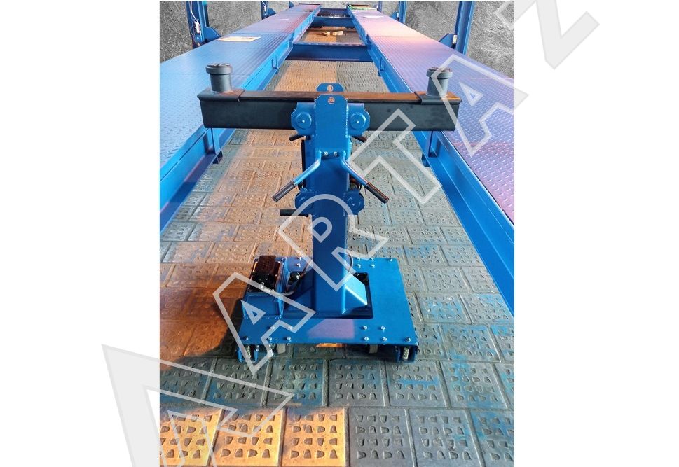 Компактная рельсовая рама и поворотные колеса обеспечивают быструю позиционировку и маневрирование в канаве. Многоуровневая система безопасности и подпружиненные защелки фиксируют траверсу в поднятом положении, исключая самопроизвольное опускание. Регулируемые подхваты позволяют адаптировать подъемник под различные типы рам и мостов. Пневмогидравлический насос устраняет зависимость от электросети и минимизирует время подготовки к работе.