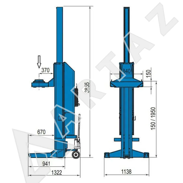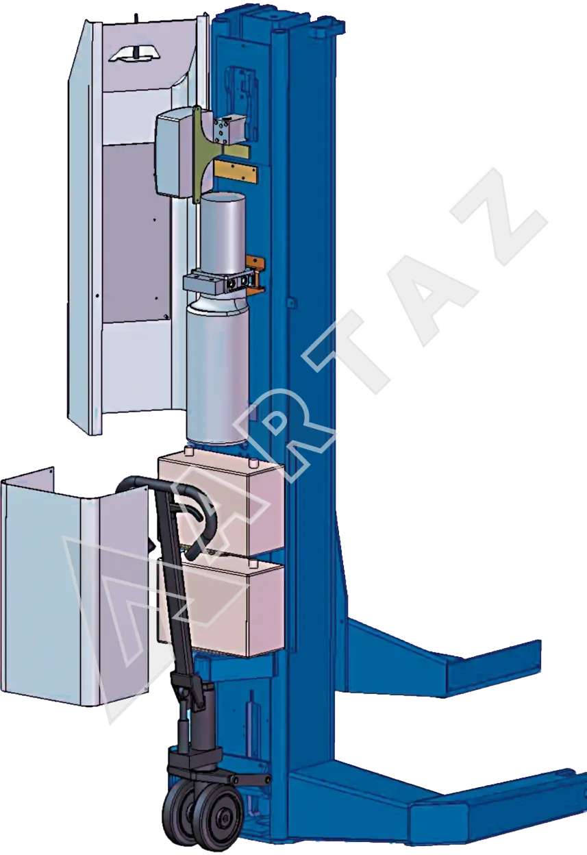 - Две подкатные колонны с электрогидравлическим приводом и аккумуляторами 12В, 100 А·ч