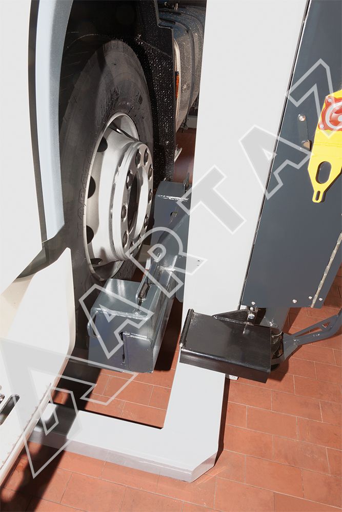 Подъемник подхватывает грузовые автомобили за колеса диаметром от 600 до 1100 мм, что минимизирует риск повреждения шин и кузова. Управление осуществляется с помощью эргономичных пультов на каждой колонне, что облегчает контроль и повышает безопасность. Благодаря подкатной конструкции оборудование легко перемещается по территории обслуживания, а высокая степень защиты и возможность эксплуатации на улице расширяют сферы применения.