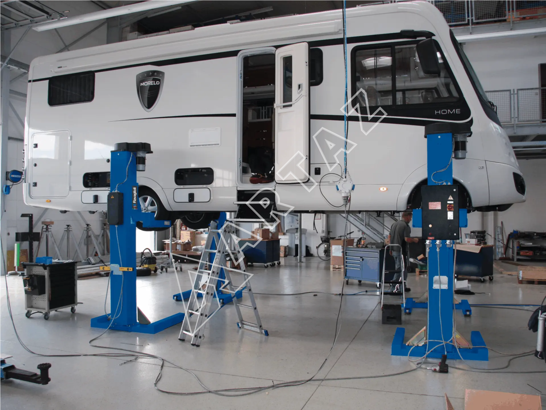 Подкатная конструкция делает перемещение комплекса по рабочему пространству простым и удобным, что особенно важно при ограниченной площади сервиса. Предохранительные стопоры обеспечивают дополнительный уровень защиты, предотвращая случайное опускание. Комплект изготовлен в Италии с применением стандартов качества европейского уровня, что подтверждает его выносливость и долговечность.