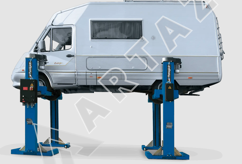 RAV242 оснащён четырьмя электромеханическими колоннами, каждая из которых выдерживает нагрузку до 7 тонн, что суммарно обеспечивает возможность подъема крупногабаритных грузовиков. Подъем за колеса позволяет сохранить целостность техники без риска повреждений. Энергопитание от сети 380 В и мощность 9,6 кВт гарантируют стабильную работу оборудования даже при интенсивном использовании. Проводная синхронизация двух осей обеспечивает равномерный подъем, снижая вероятность перекосов и увеличивая срок эксплуатации устройств.