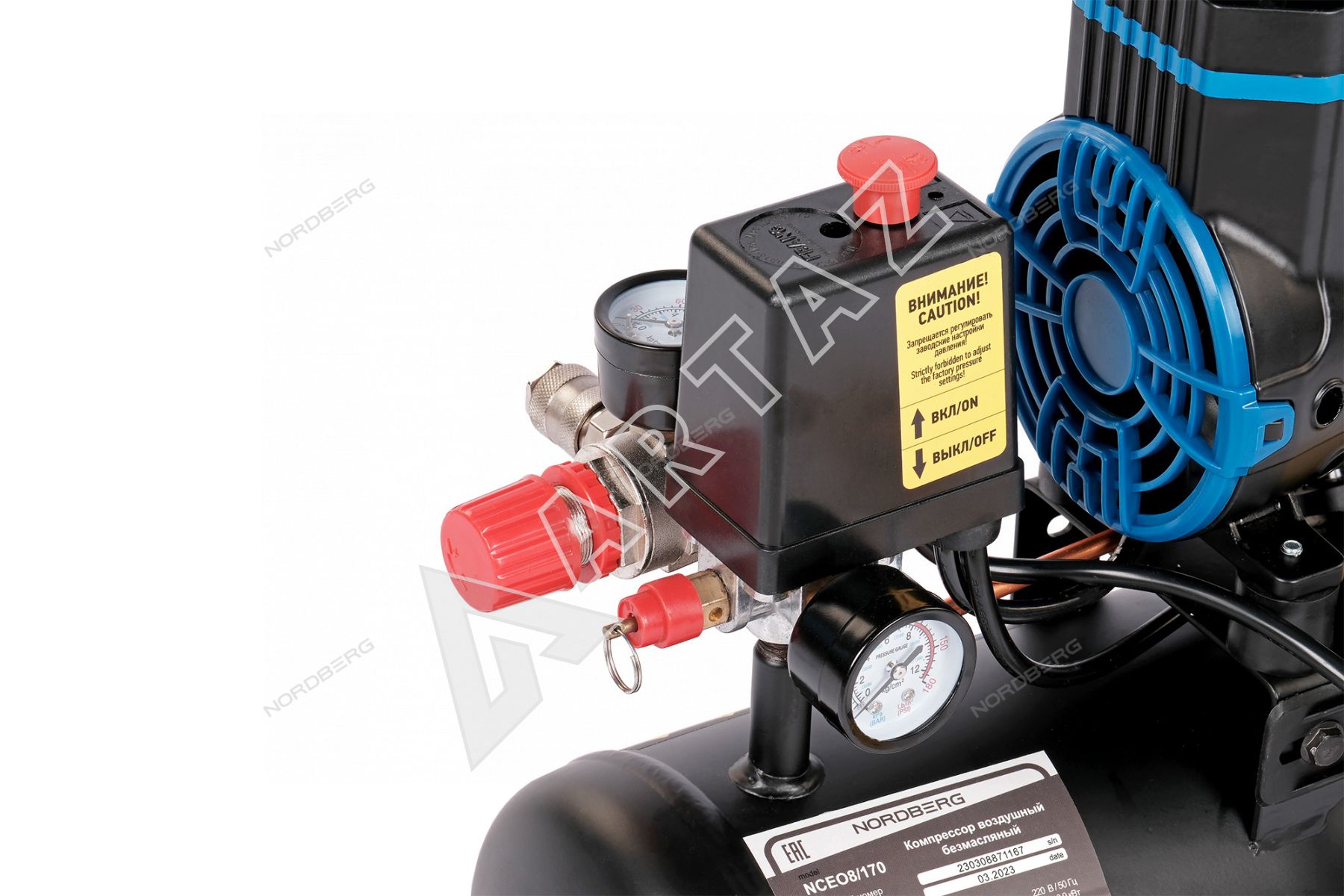 Двухпоршневой безмасляный воздушный компрессор Nordberg NCEO8/170 8 л, 170 л/м, 220В, 0.9 кВт для гаража, накачки шин, применения в быту и в производстве