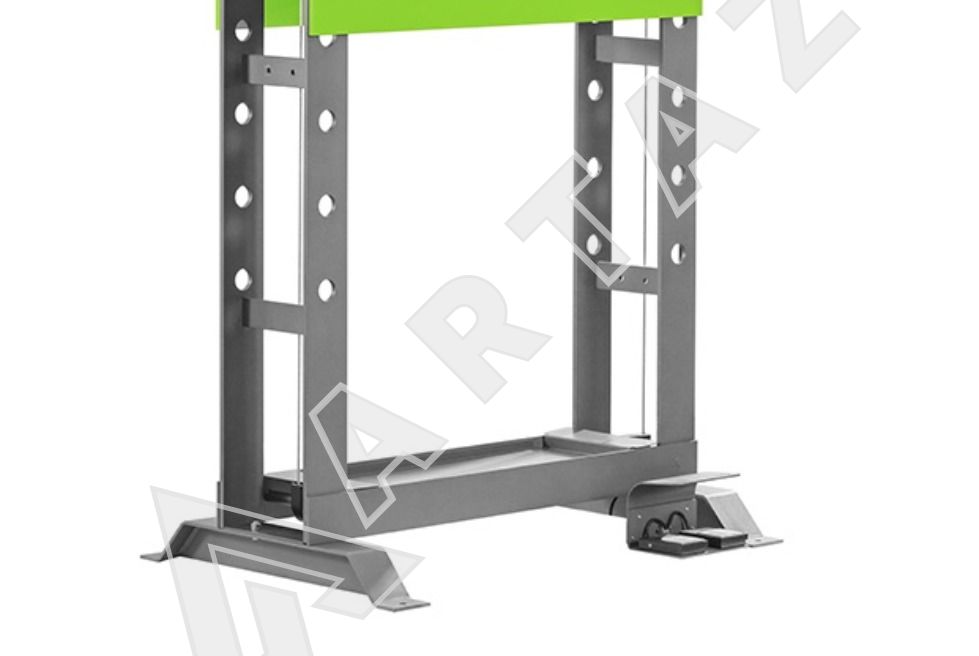 Пресс оснащен сварной П-образной рамой, обеспечивающей прочность и устойчивость конструкции. Электрогидравлический привод с ножной педалью обеспечивает удобное и точное управление усилием. Благодаря горизонтальному смещению цилиндра рабочее пространство адаптируется под разные задачи, а высокая максимальная высота установки позволяет размещать детали любого размера.