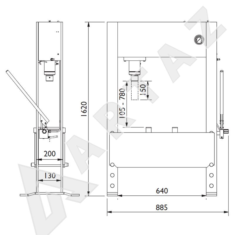 Малые ручные гидравлические прессы для автомастерских и легкой промышленности - Точный высокоскоростной пневматический подъемник с ножным управлением для приближения обрабатываемой детали. - Подвижный поршень; - Поперечный подъемник; - Встроенный индикатор давления на удобной для глаз высоте; - Встроенный защитный разгрузочный клапан; - Сварная рама и плита пресса из долговечной высокопрочной стали; - Съемная торцевая заглушка подъемника для монтажа различных поршневых головок; - Поставляется с 2 призмами.