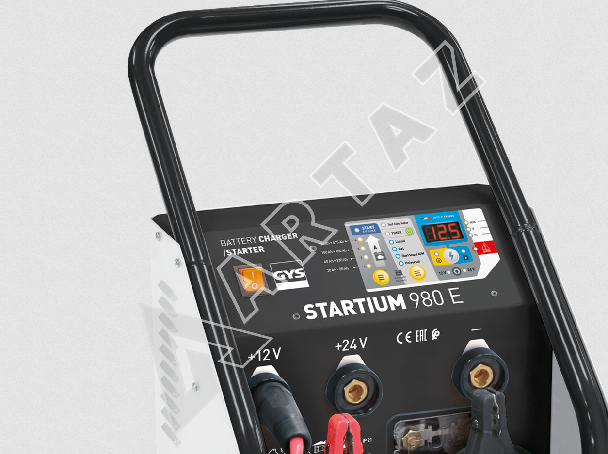 Пуско-зарядное устройство GYS STARTIUM 980E предназначено для профессионального обслуживания аккумуляторов с напряжением 12 и 24 В и емкостью от 20 до 750 Ач. Оно специально разработано для автосервисов и станций технического обслуживания, обеспечивая надежный запуск и эффективную зарядку аккумуляторов различной техники.