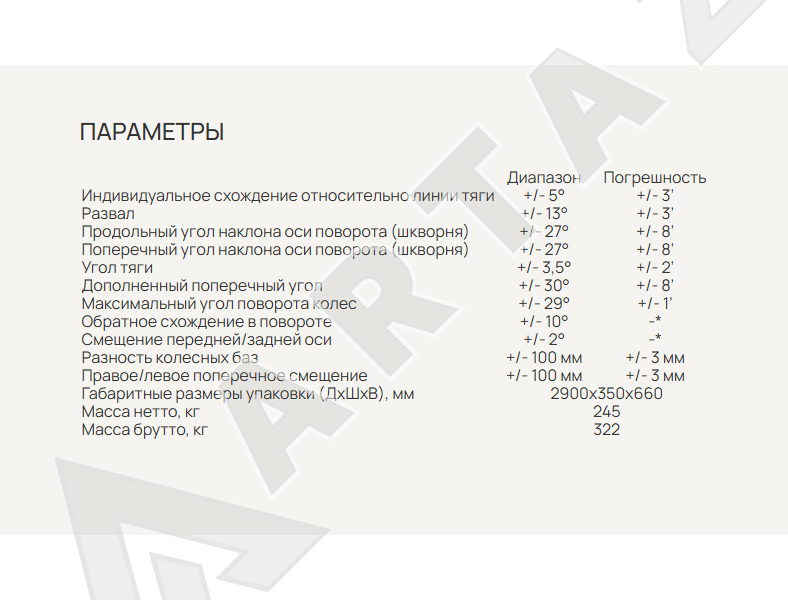 - Точность регулировки углов развала и схождения согласно современным стандартам;