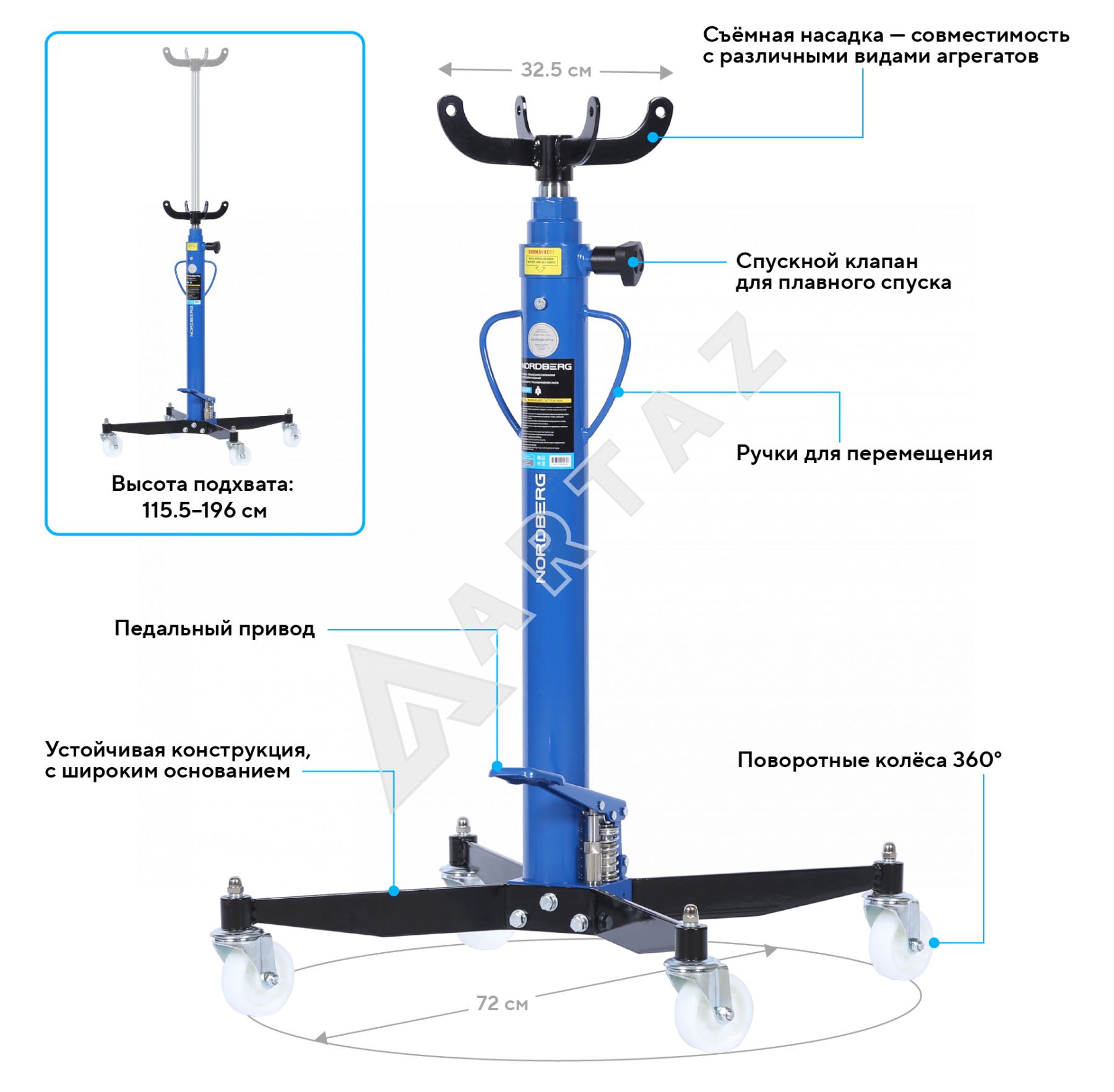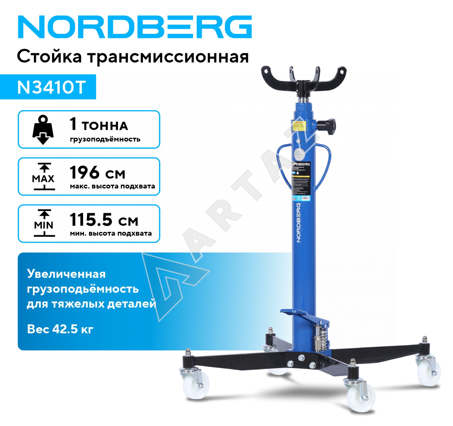 Гидравлическая стойка Nordberg N3410T с грузоподъемностью 1 тонна предназначена для подъема и фиксации трансмиссионных узлов в условиях автосервиса, станций техобслуживания и автотранспортных предприятий. Она оптимальна для работы с КПП, мостами и другими агрегатами легковых и коммерческих автомобилей.