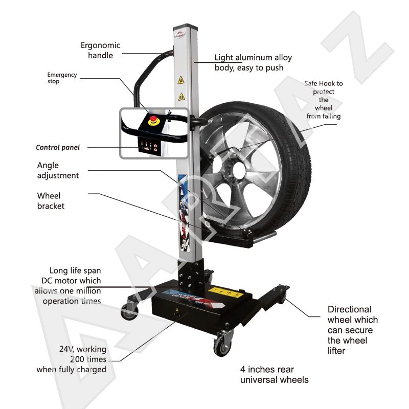 Электрический привод обеспечивает плавный и точный подъём колеса на высоту до 1200 мм, что сокращает время установки и снижает риск ошибок при совмещении болтовых отверстий. Компактный корпус из алюминия сочетает прочность и лёгкость, облегчая перемещение по цеху на поворотных колесах. Встроенные аккумуляторы обеспечивают автономную работу без привязки к сети, а ролики и страховочные крепления обеспечивают безопасную фиксацию и проворачивание поднятого колеса.