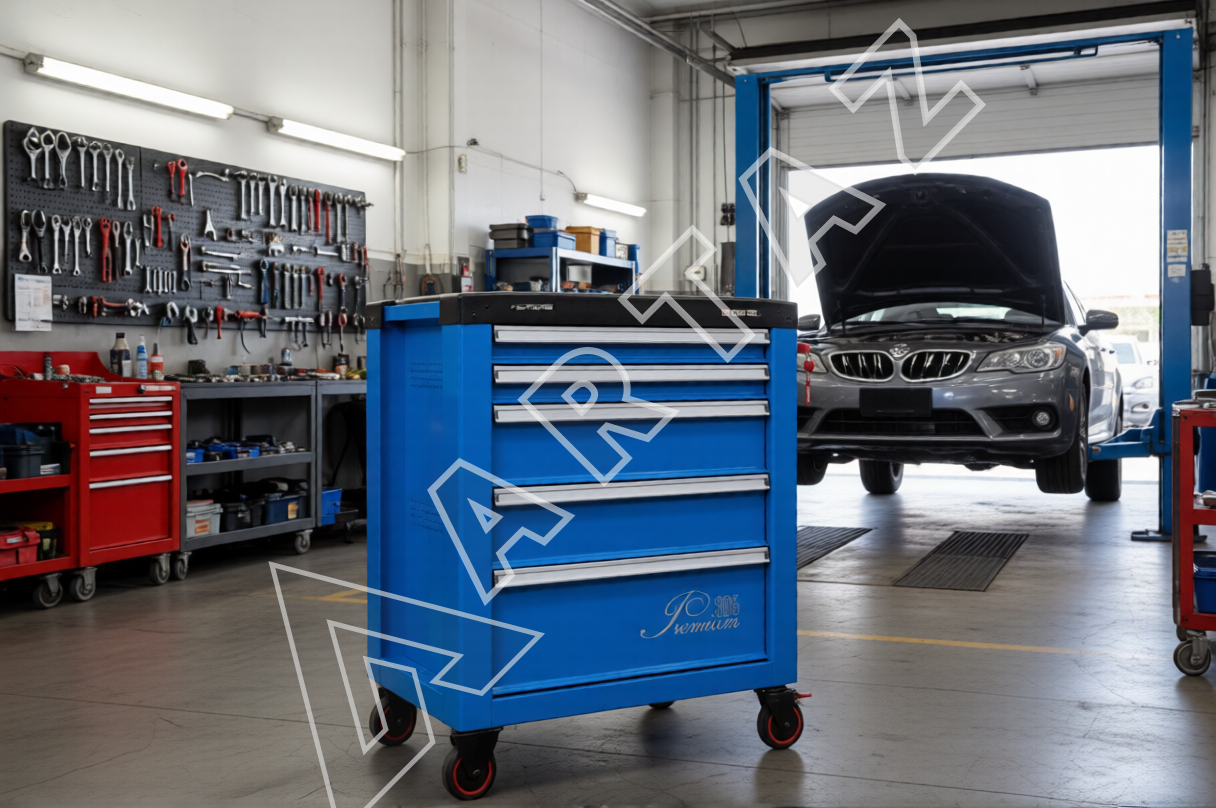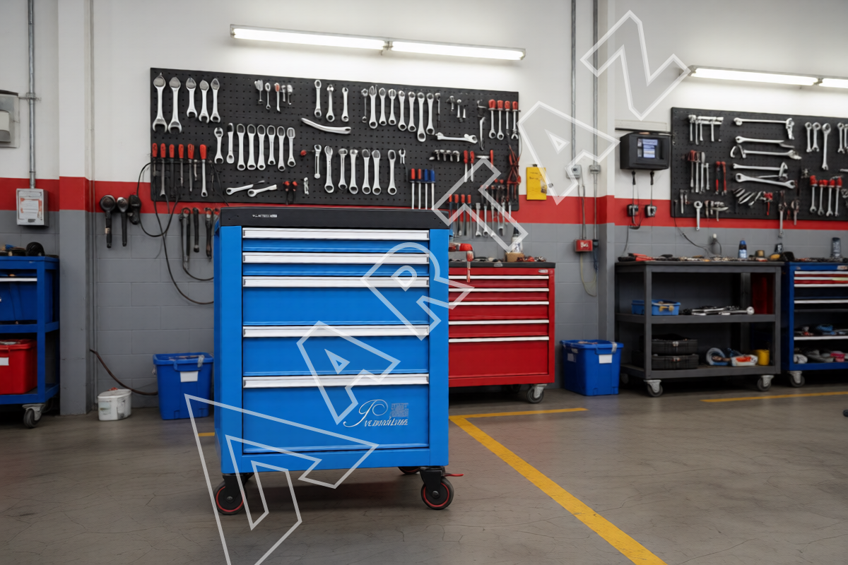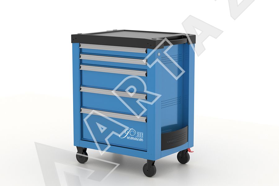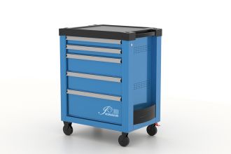 Эта модель оснащена пятью выдвижными ящиками разного размера с системой направляющих на подшипниках, которые обеспечивают плавный и легкий ход. Тележка выдерживает общую нагрузку до 270 кг, что позволяет хранить как легкий, так и тяжелый инструмент без риска повреждений.