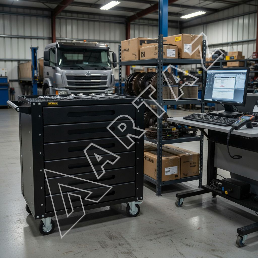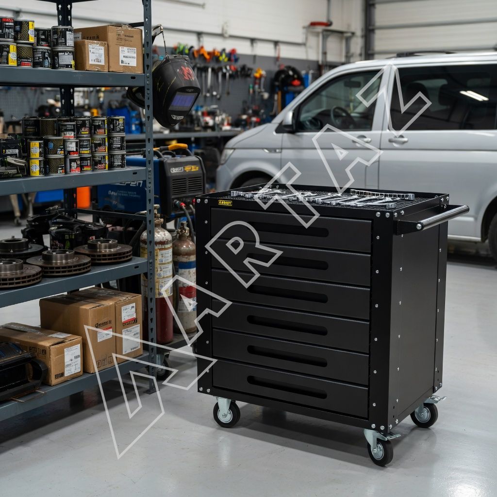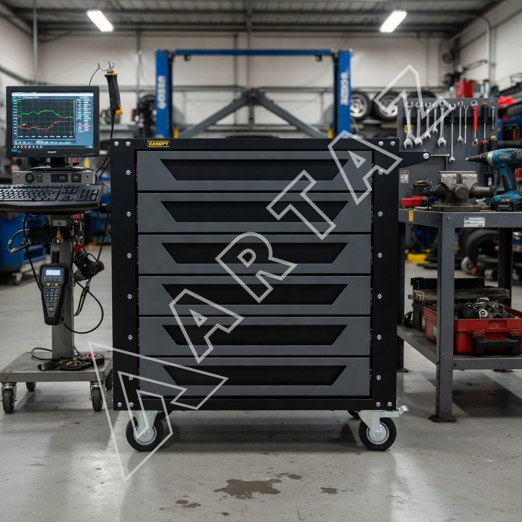 Это удобное и прочное решение для мастерских, гаражей и сервисных центров. Модель оборудована прочными колесами с фиксацией, что обеспечивает устойчивость при перемещении. Толстый металлокорпус с порошковым покрытием гарантирует долговечность и защиту от внешних повреждений. Ручка универсальна — её можно установить с любой стороны, а верхняя поверхность с твердым ковриком из EVO материала подходит для работы с мелкими деталями. Возможность дополнительно закрепить карман GTPPD6 расширяет функциональность и упрощает доступ к часто используемым инструментам.