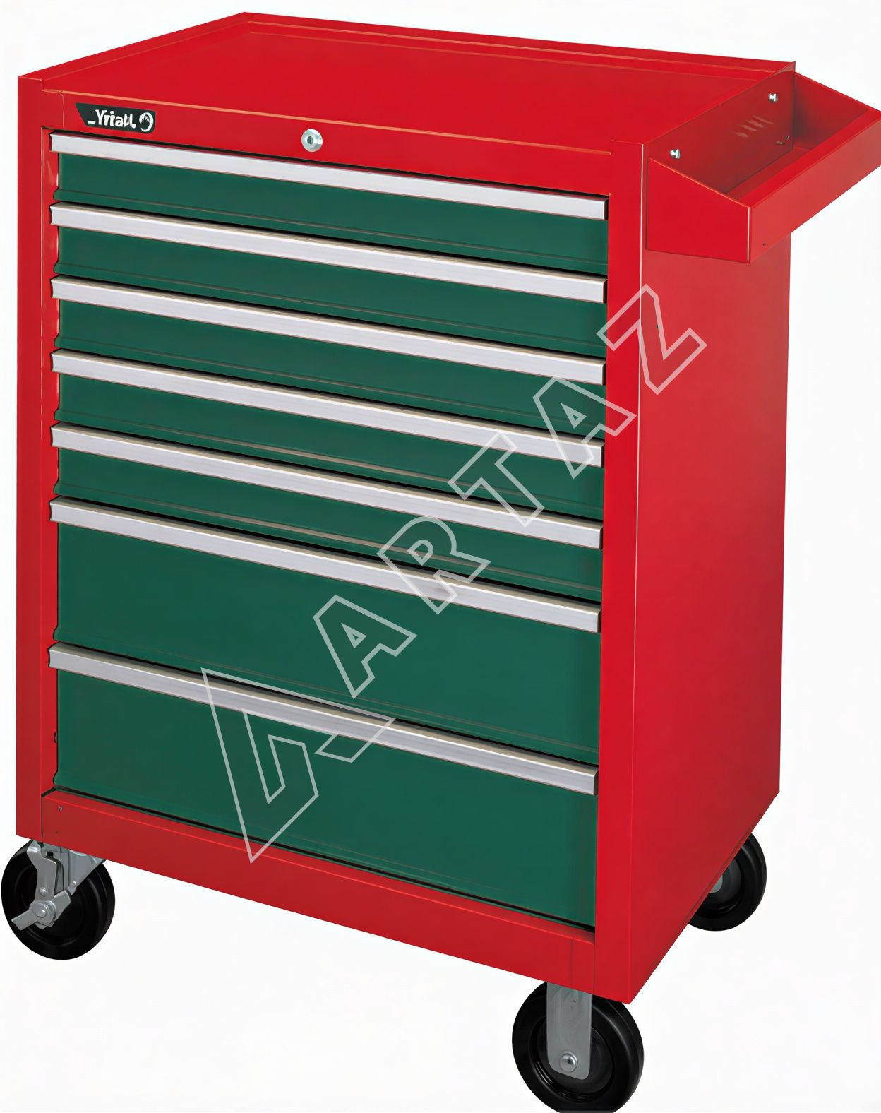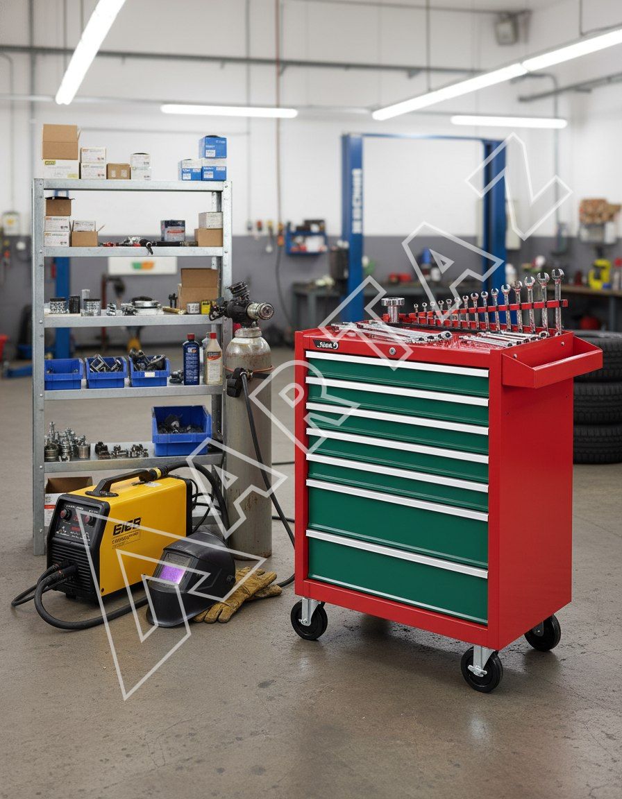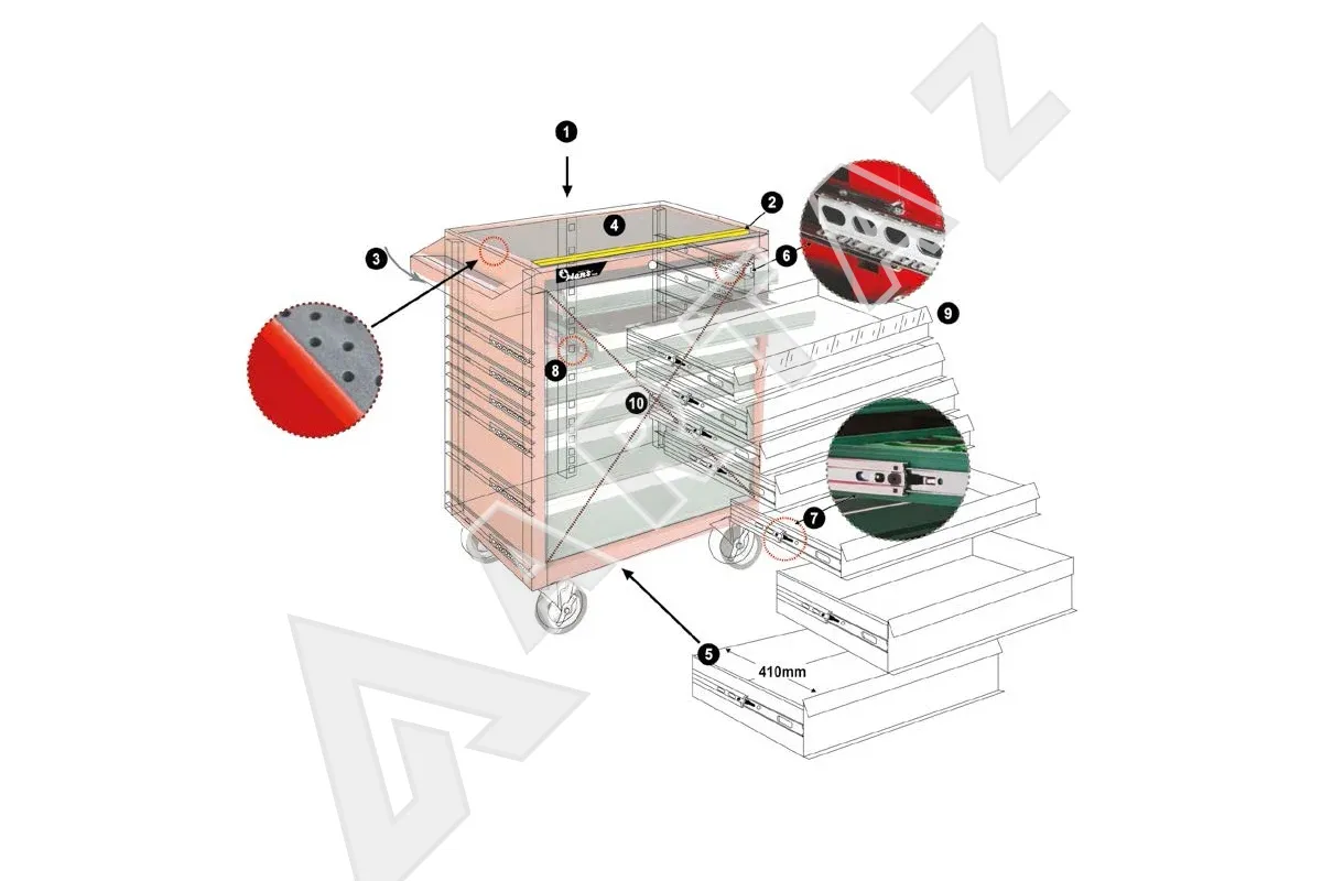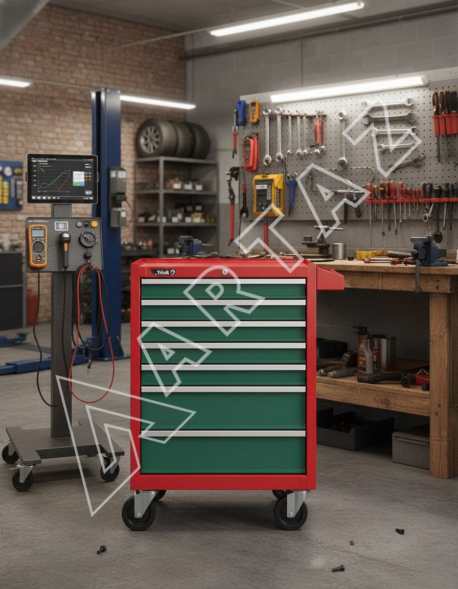 Модель 9917HQ изготовлена на Тайване и отличается качественной сборкой и продуманным дизайном. Тележка оснащена 5 выдвижными полками и 2 ящиками с подшипниковыми направляющими для плавного и долговечного использования. Центральный замок обеспечивает безопасность содержимого, а фиксация колесиков гарантирует устойчивость во время работы. Поверхность окрашена порошковой краской — это надежная защита от коррозии и механических повреждений. Просторная плоская столешница служит удобной рабочей площадкой для мелкого ремонта и организации деталей.