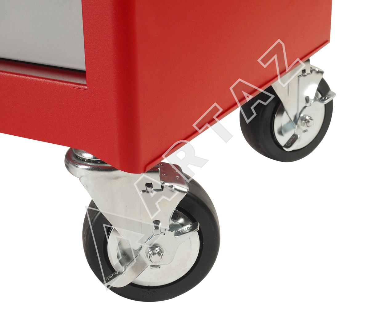 Колеса диаметром 127 мм с фиксацией гарантируют маневренность и устойчивость тележки, позволяя легко перемещать ее по рабочей зоне. Боковые приспособления для хранения ключей с Т-образной ручкой добавляют удобства в организации пространства. Плоский лоток на верхней панели служит дополнительной рабочей поверхностью для мелких деталей и инструментов.