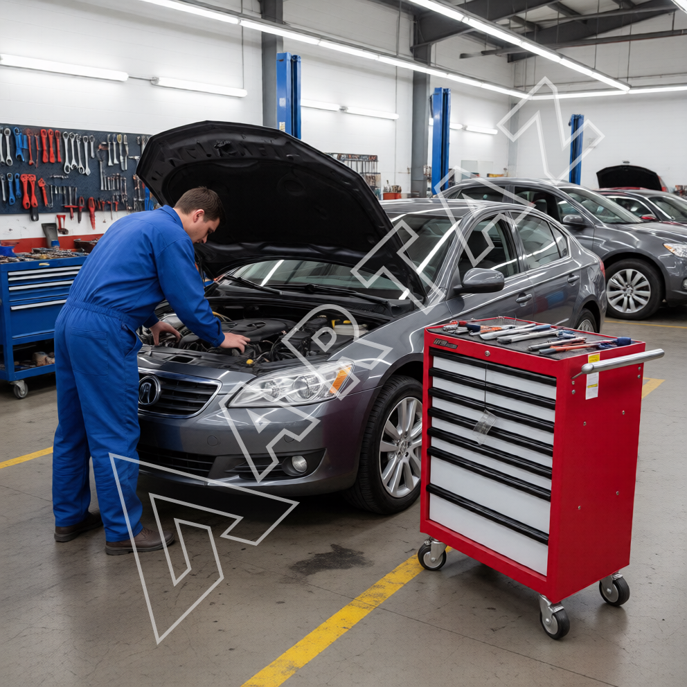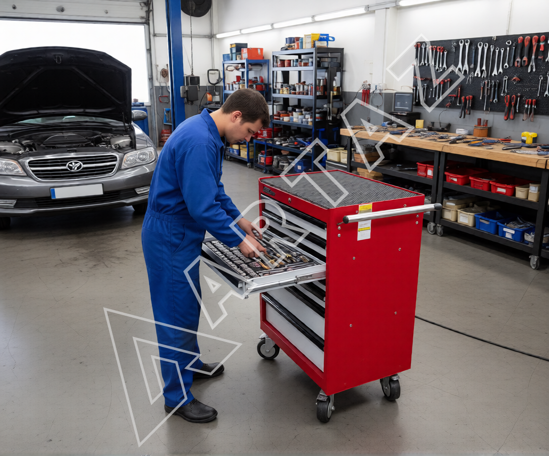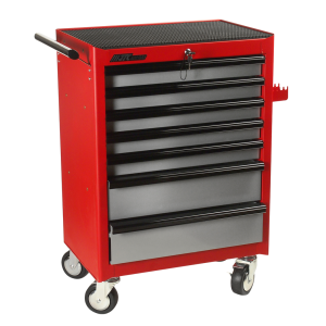 Тележка оснащена семью функциональными секциями: пять плоских и два глубоких выдвижных ящика обеспечивают рациональное размещение инструментов. Удобные роликовые направляющие с надежными фиксаторами предотвращают самопроизвольное открытие и обеспечивают плавное и комфортное выдвижение секций. Конструкция выполнена из высококачественной сварной стали с долговечным порошковым покрытием, что гарантирует устойчивость к истиранию и коррозии.