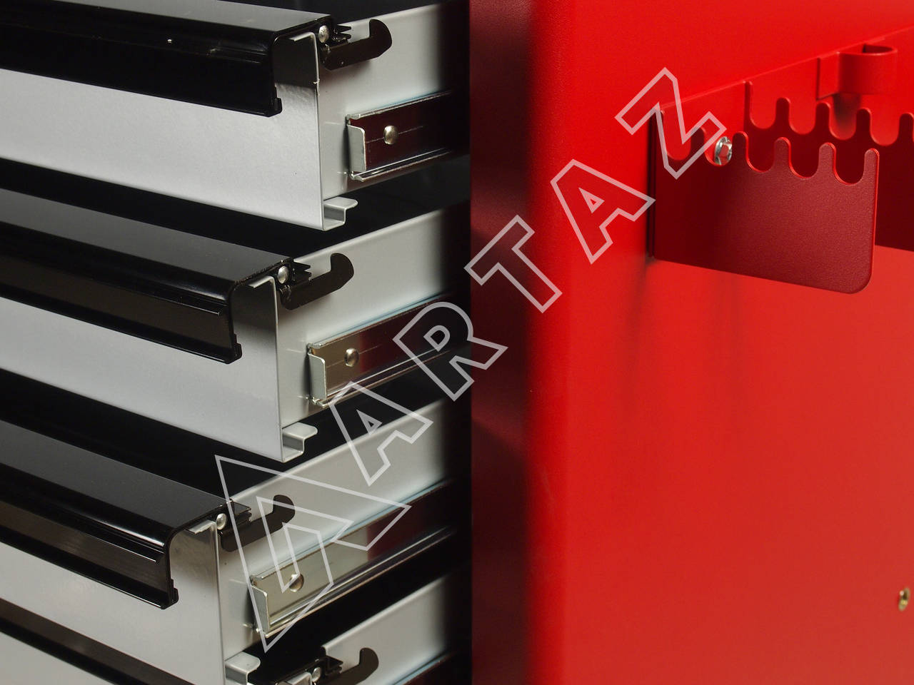 Центральный замок и индивидуальные замки в каждом ящике обеспечивают высокий уровень безопасности. Колеса диаметром 127х50 мм с фиксаторами обеспечивают легкость перемещения и устойчивость тележки, даже при полной загрузке. Тележка оснащена дополнительными держателями для ключей с Т-образной ручкой на боковой стенке – это удобно и повышает организацию рабочего пространства.