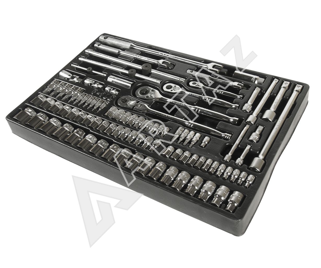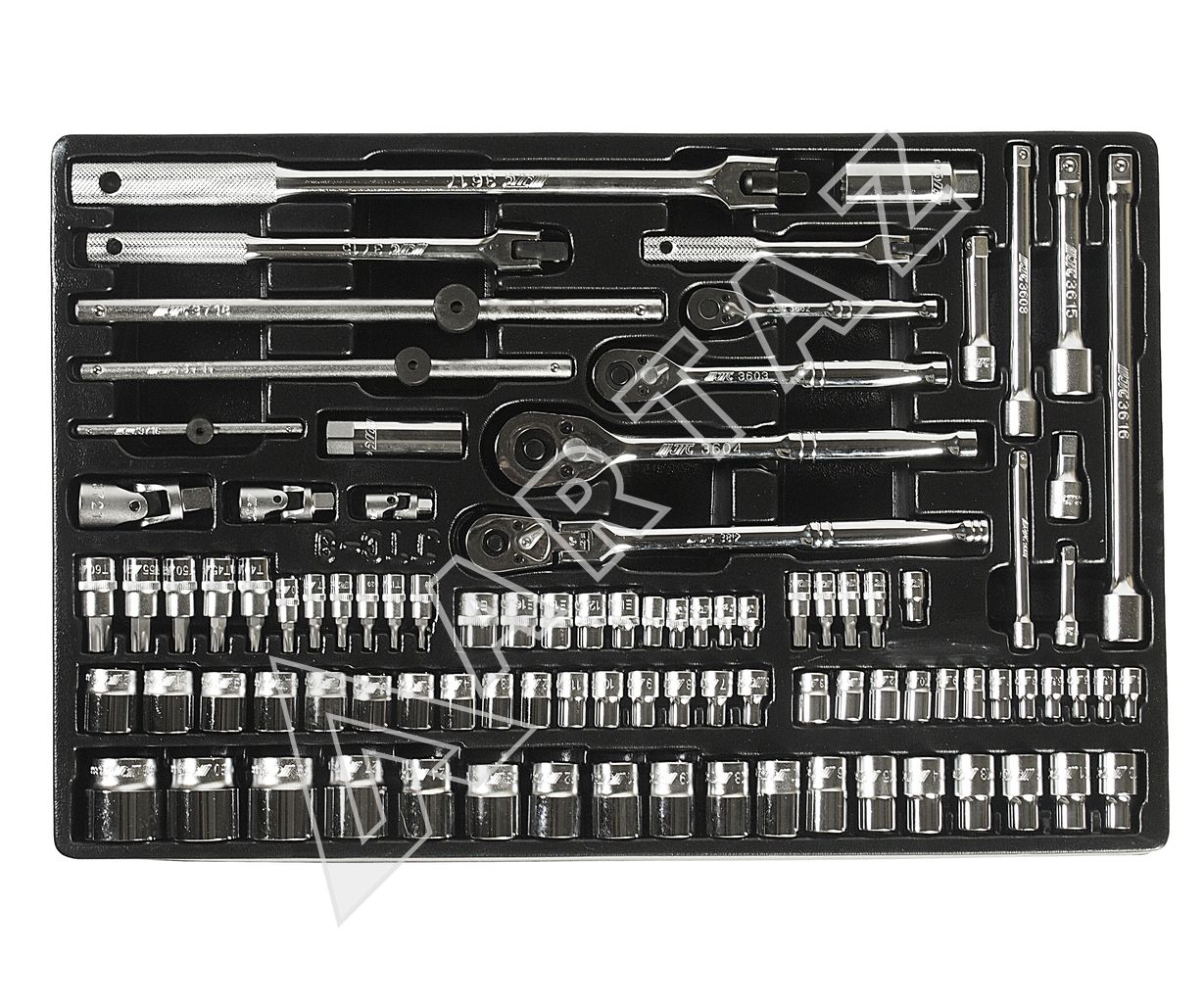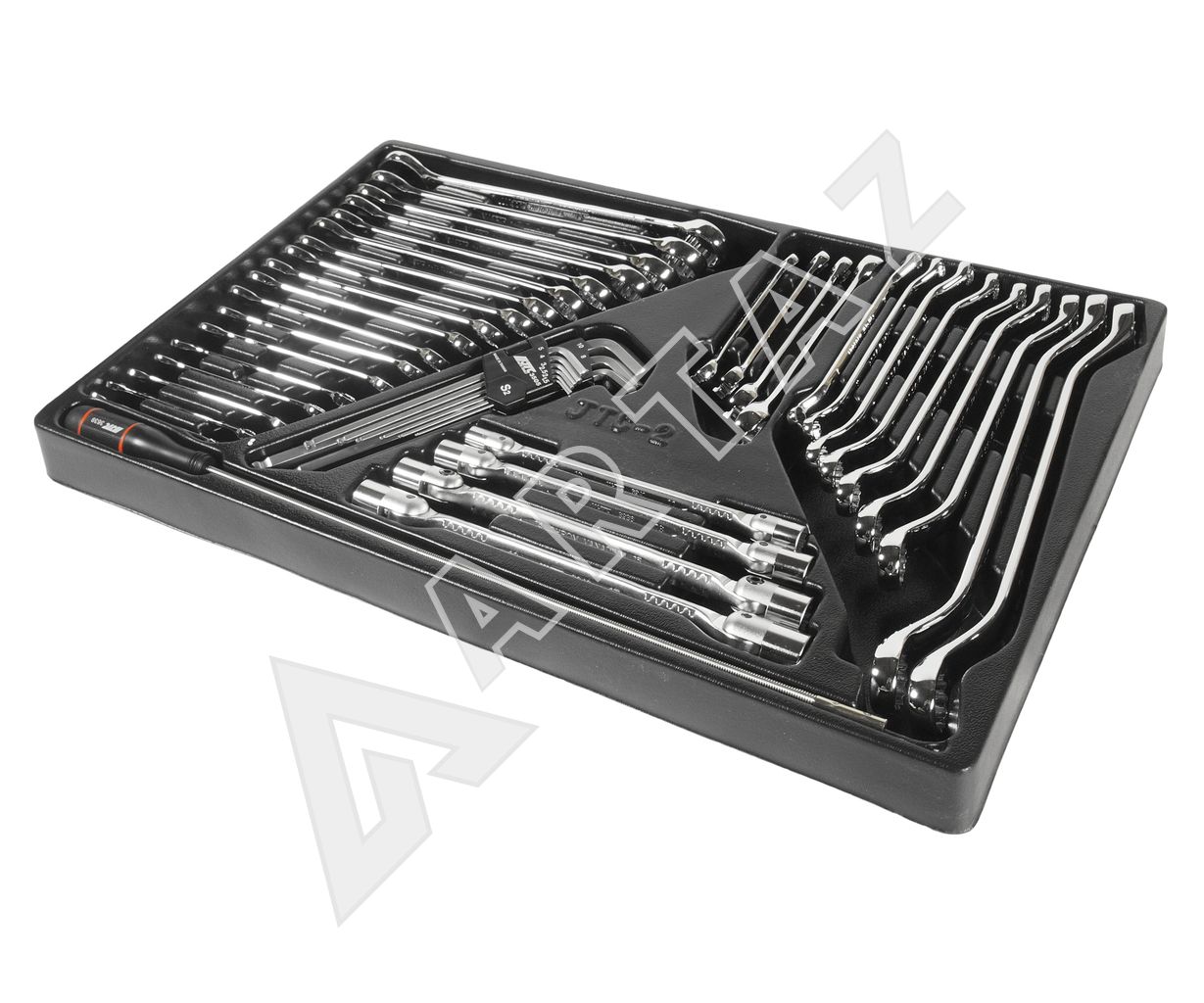 Особое удобство добавляют боковые приспособления для ключей с Т-образной ручкой, а наличие ложементов способствует аккуратному размещению инструмента. В комплект входят отвертки, ключи разных видов, головки, трещотки и другие необходимые аксессуары, что делает такой набор универсальным решением для мастерских и сервисных центров.
