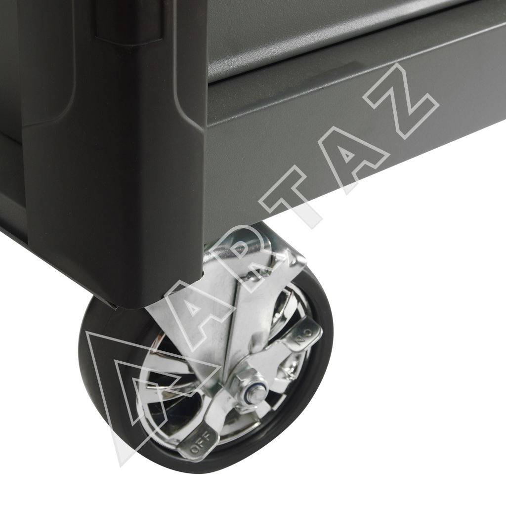 Колеса диаметром 127 мм с фиксацией обеспечивают стабильность и легкость перемещения по поверхности. Тележка укомплектована лотком с органайзером на столешнице для хранения мелких деталей и быстро востребованных инструментов. Наличие доводчиков повышает комфорт эксплуатации за счет плавного закрытия ящиков. Система RFS помогает организовать процесс работы, делая его максимально эффективным и безопасным.