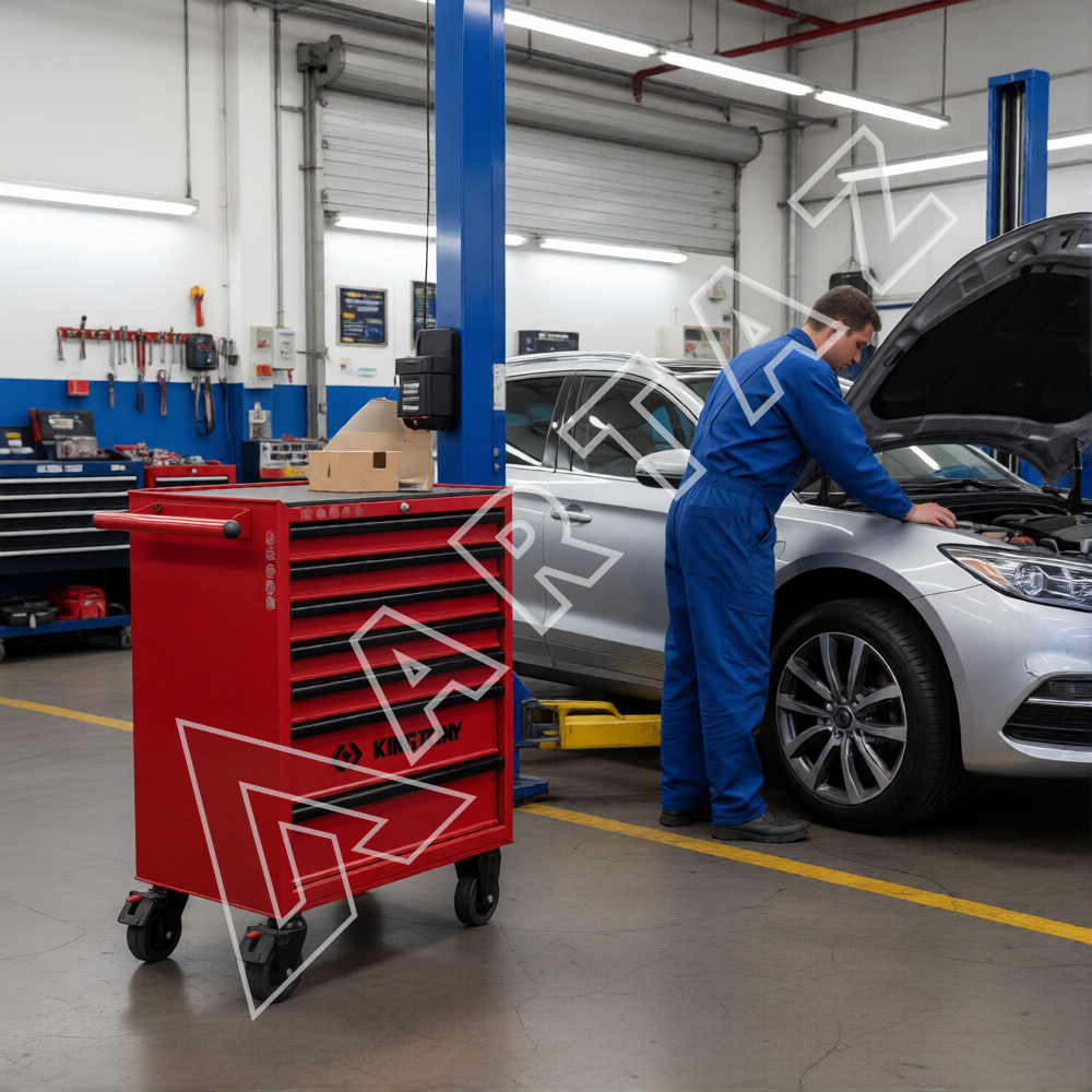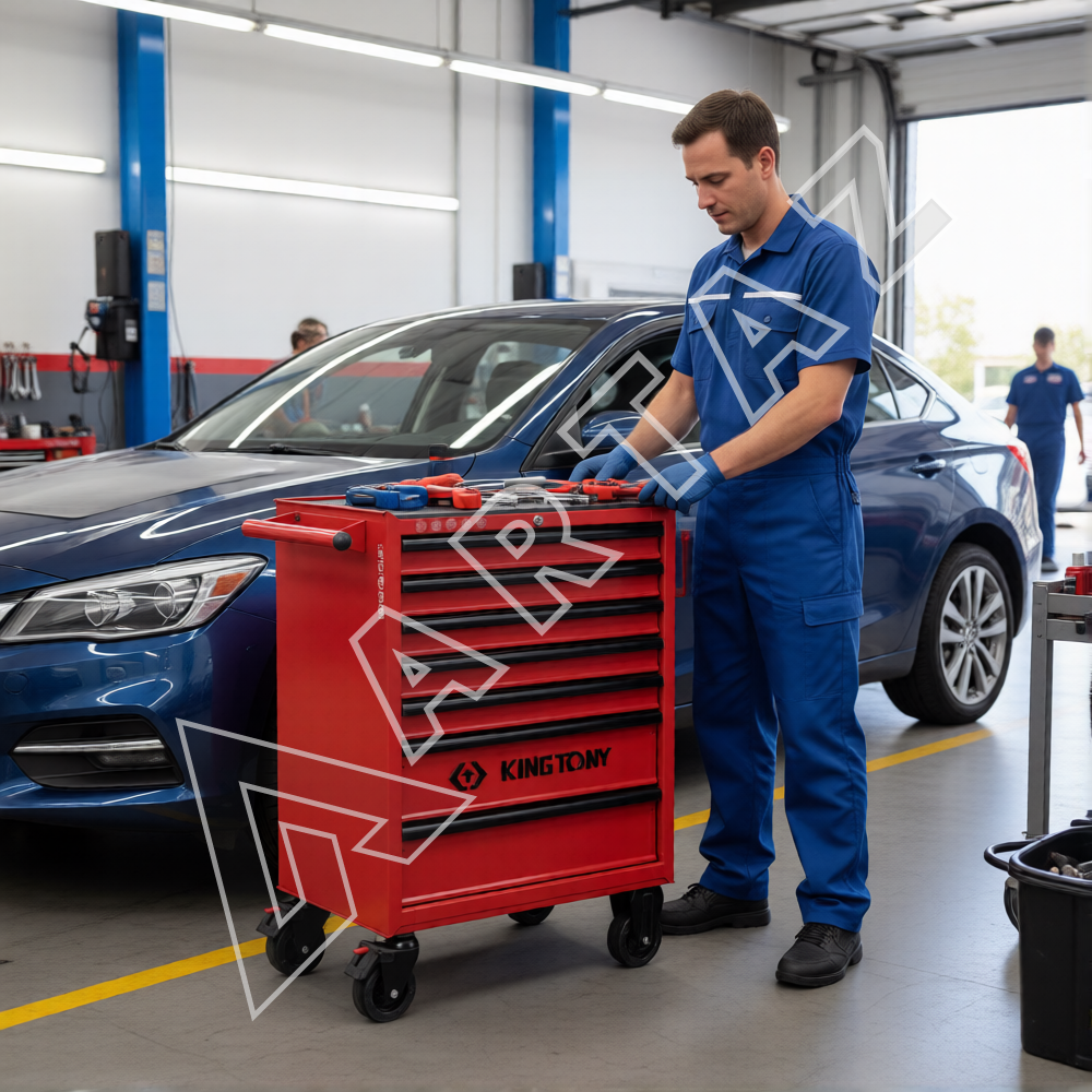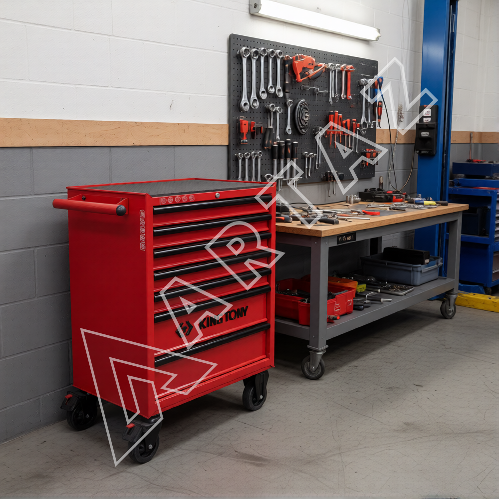 Эта профессиональная тележка с центральным замком и фиксацией колёс гарантирует безопасность и удобство эксплуатации. Надёжные направляющие на подшипниках обеспечивают плавное открытие ящиков, выдерживающих нагрузки до 50 кг. Корпус выполнен из прочной листовой стали с порошковым покрытием, защищающим поверхность от царапин и коррозии. Благодаря рациональному распределению 5 полок и 2 больших ящиков, вы сможете удобно систематизировать инструмент по назначению или частоте использования. Плоский лоток на столешнице с защитным ковриком позволяет дополнительно размещать часто используемые предметы под рукой. Компактные размеры и блокируемые вращающиеся колёса обеспечивают лёгкость передвижения и устойчивость рабочего места. Тележка идеально подходит для автосервисов, производственных участков и мастерских, где ценится порядок, доступность и надёжность хранения.