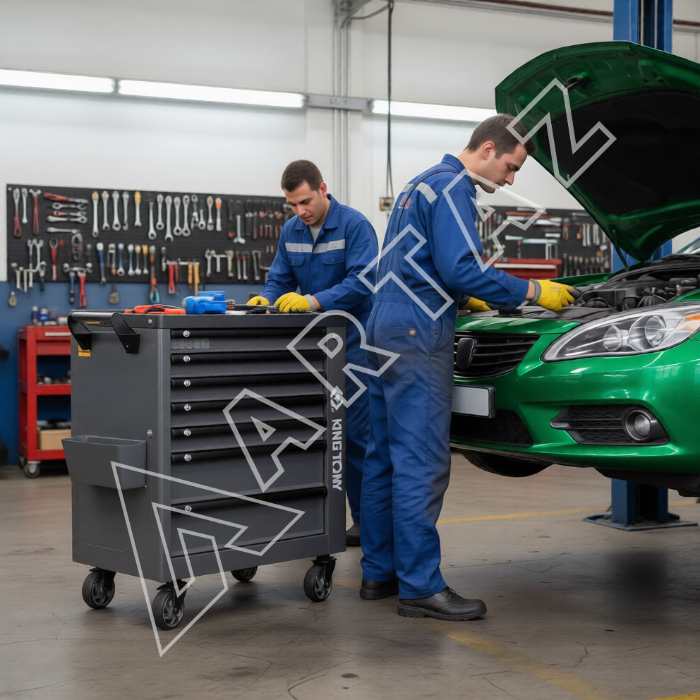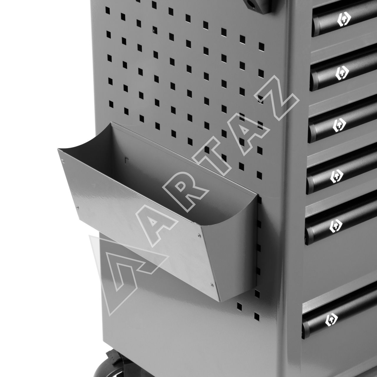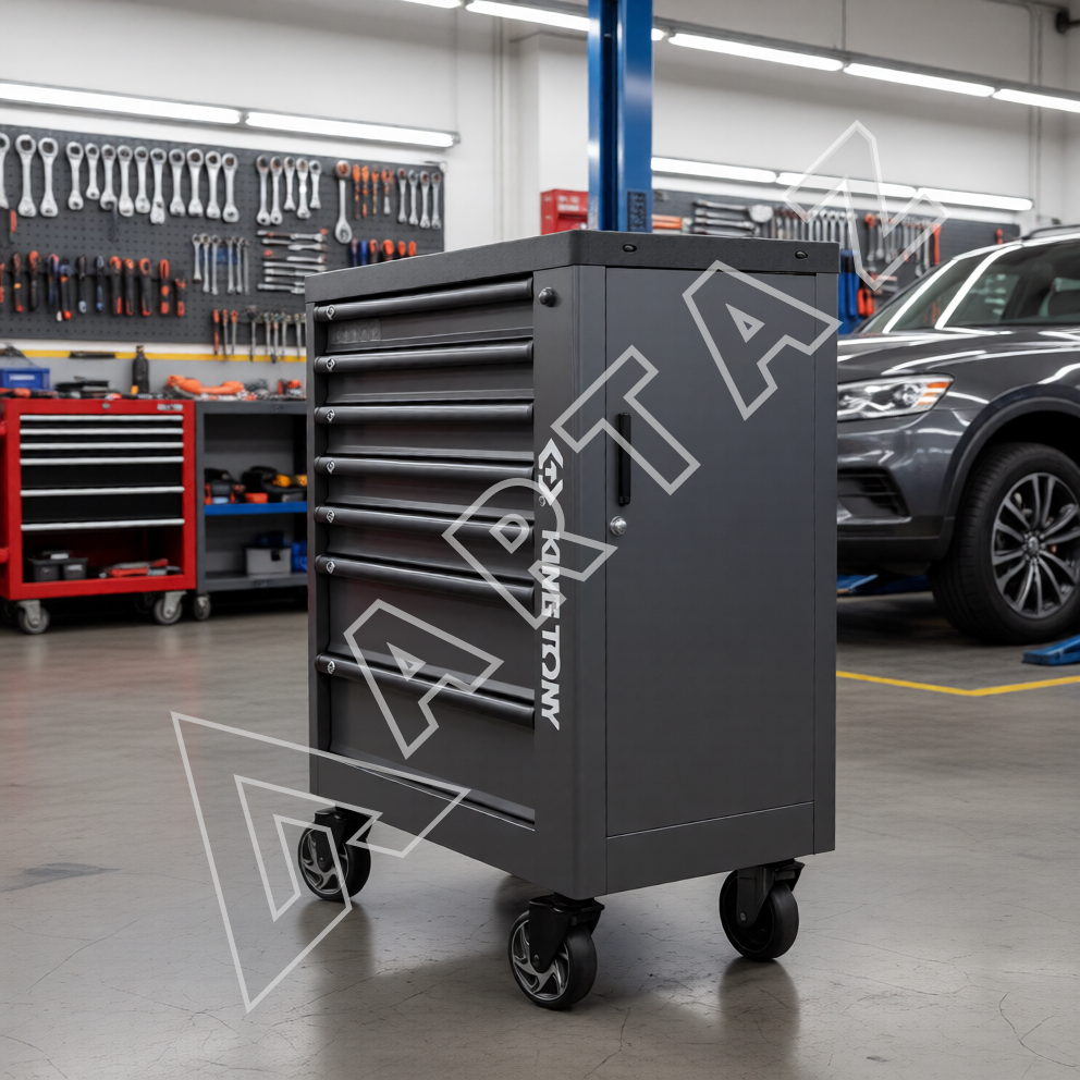 Эта профессиональная тележка изготовлена из прочной сварной конструкции с порошковым покрытием, что обеспечивает устойчивость к механическим повреждениям и коррозии. 7 оптимально спроектированных ящиков выдерживают нагрузку до 35 кг каждый, позволяя хранить даже тяжелые инструменты и комплектующие. Центральный замок надежно блокирует все ящики, предотвращая случайное раскрытие и обеспечивая безопасность хранения. Рукоятки из алюминия и поворотные колеса с фиксацией обеспечивают легкость перемещения и устойчивость на рабочем месте. Встроенный верхний лоток с органайзером и боковые отсеки расширяют возможности хранения мелких деталей и аксессуаров, повышая эффективность работы. Эргономичный дизайн с матовым серо-черным покрытием делает тележку удобной и стильной, подходящей для любой мастерской или производственного помещения.