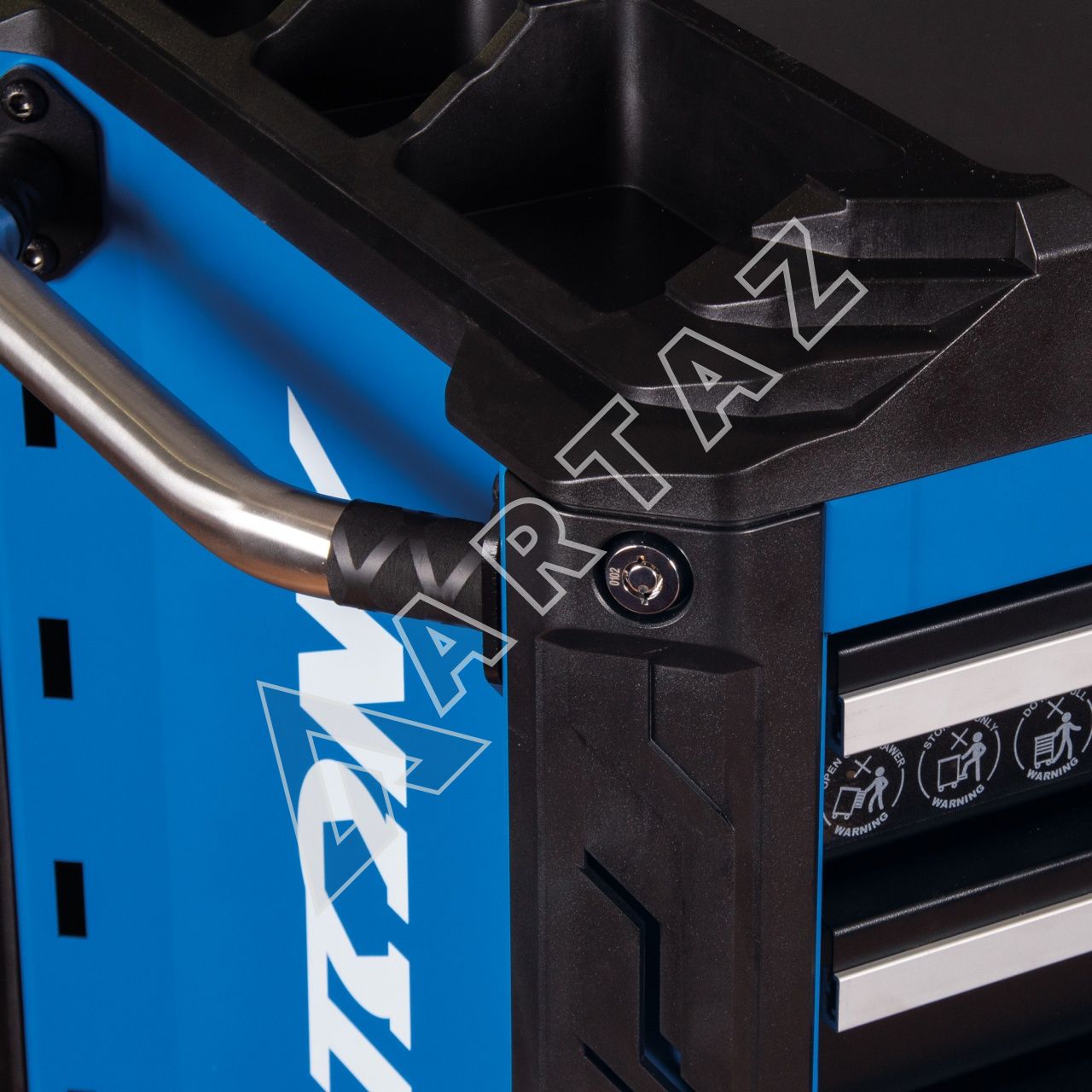 Модель 87SQ31-7B-BK оснащена семью вместительными ящиками с плавным ходом на подшипниковых направляющих и системой RFS, которая блокирует одновременное открытие нескольких секций – это гарантирует безопасность и предотвращает опрокидывание. Порошковое покрытие и прочная сварная конструкция обеспечивают долговечность и устойчивость к нагрузкам до 500 кг. Центральный замок с доводчиками защищает содержимое, а поворотные колёса с фиксацией обеспечивают лёгкость перемещения тележки даже в ограниченном пространстве. Верхняя столешница с лотком-органайзером позволяет удобно размещать мелкие детали и инструменты под рукой. Цветовая гамма в черно-синем исполнении придаёт профессиональный и аккуратный вид обладателю рабочего места.