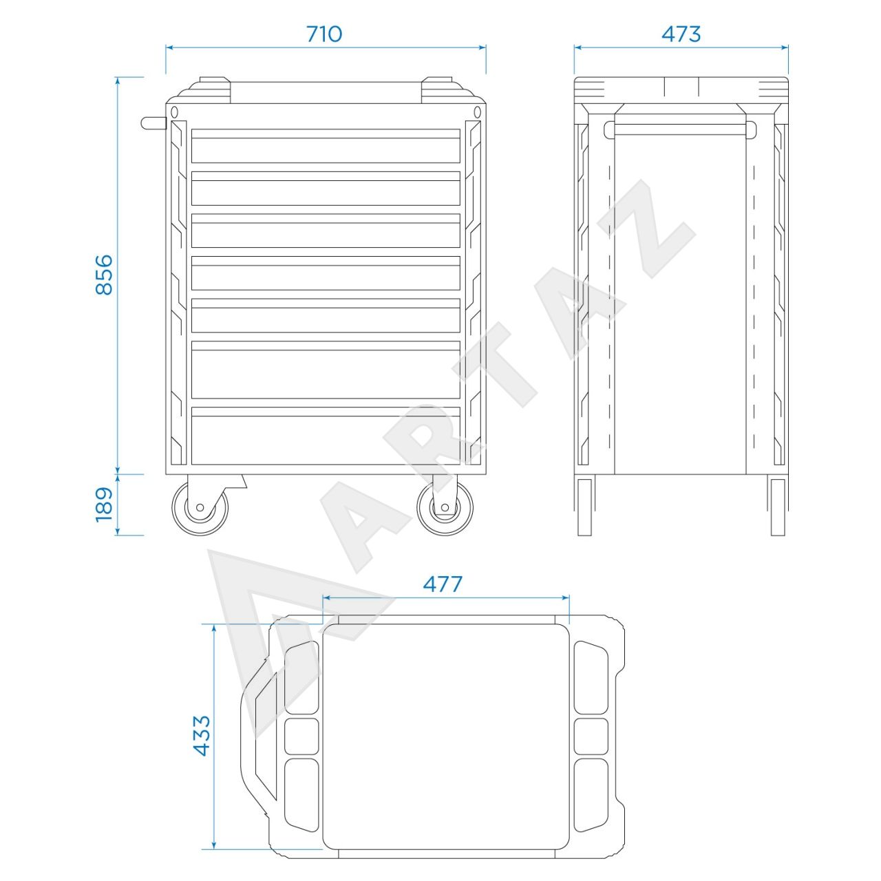 - Инструментальная тележка с 7 выдвижными ящиками (5 полок + 2 глубоких ящика)